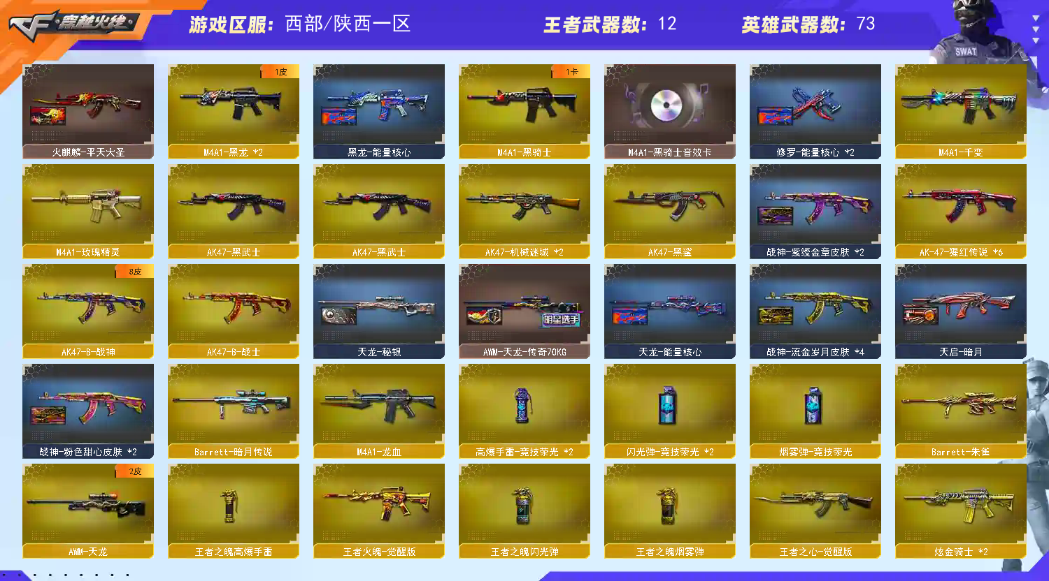 【主武器】M200-幻神/98K-星神/斯太尔蝴蝶/炼狱悦蓝觉醒/炼狱⑥烈龙⑥盘龙/③雷神/③火麒麟/千变/②黑龙/黑武士/黑骑士/②机械迷城/黑鲨/龙血/玫瑰精灵/王者之心觉醒/猩红传说/王者火魄觉醒/天龙/毁灭/5极光/裁决/朱雀炮/暗月传说大炮/雷神精英刀锋/2炫金骑士/炫金千变/致命乱世超越Max/激光毁灭者3/金色小号/牛牛AK47/EVO赤血龙魂/ 【副武器】COP-堕天神/柯尔特-竞技荣光/2天神/4修罗/COP旗袍/ 【近身武器】王者之峰觉醒/⑤屠龙/②龙啸/③屠龙/③擎天/2黄金生化钩/手斧镜/降世魔童/招财猫枪王排位 【投掷武器】②高爆竞技荣光+烟闪/王者之魄高爆+烟闪/迷你生化手雷/ 【角色】电竞教官云悠悠+三防/王者葵貂蝉+爆破四防/王者涂鸦+爆破四防/王者魅影+四防/王者迷迭香+三防/零/王者之瞳/对讲机/炫彩背包/圣灵戒/魔龙戒/ 【皮肤】雷神-虎将皮肤/炼狱-星空皮肤/天龙-传奇70KG皮肤/耀金毁灭皮肤/ 【音效卡】毁灭音效卡/黑骑士音效卡/ 【道具】紫金大元首/全背包/钩子/防化服/变异宝贝/步枪弹夹/爆破号;电竞教官-云悠悠,RPK-盘龙,M200-幻神,Kar98K-星神,