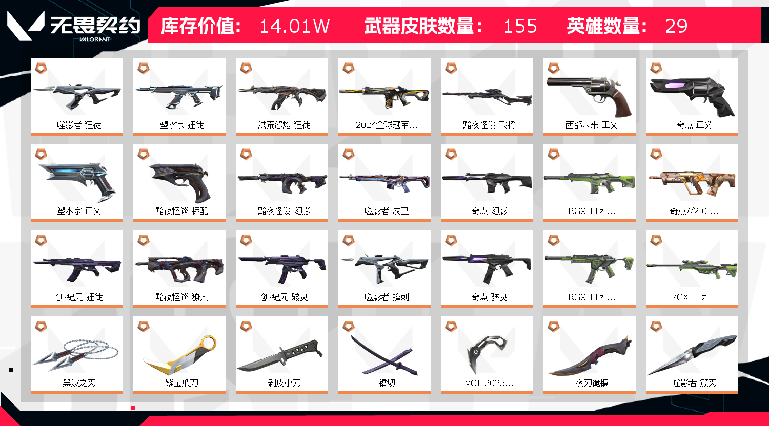 首页 > 租号大厅 > 无畏契约-wegame > wegame/wegame > 【秒解冻】14W库⚡仙女棒⚡猫猫狂徒⚡VCT爪⚡流脓狂徒⚡龙炎狂徒⚡纪元套⚡猫猫套离子噬影显卡黯夜套