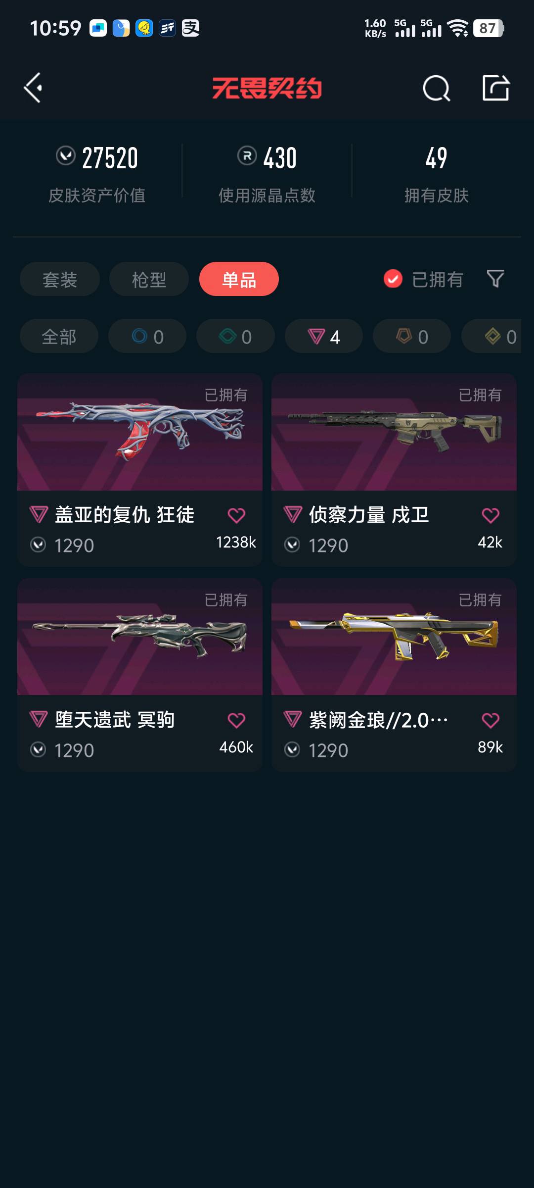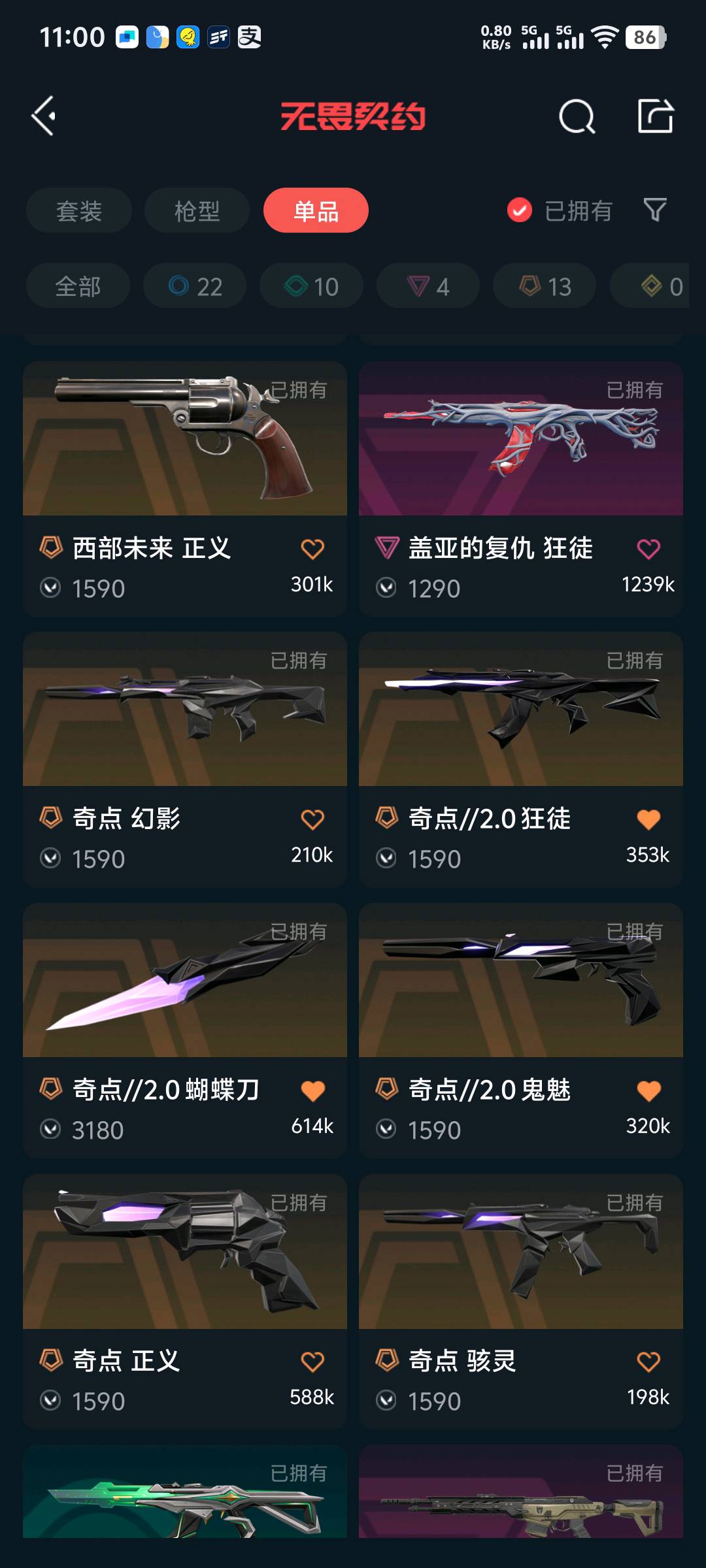 【当前段位:白银11)【可排位】刀皮:落樱飞旋+奇点2.0 ak:盖亚+塑水宗+奇点,幻影:紫金+千灵华绽+奇点2.0;盖亚的复仇 狂徒,塑水宗 狂徒,堕天遗武 冥驹,西部未来 正义,奇点 正义,千灵华绽 正义,