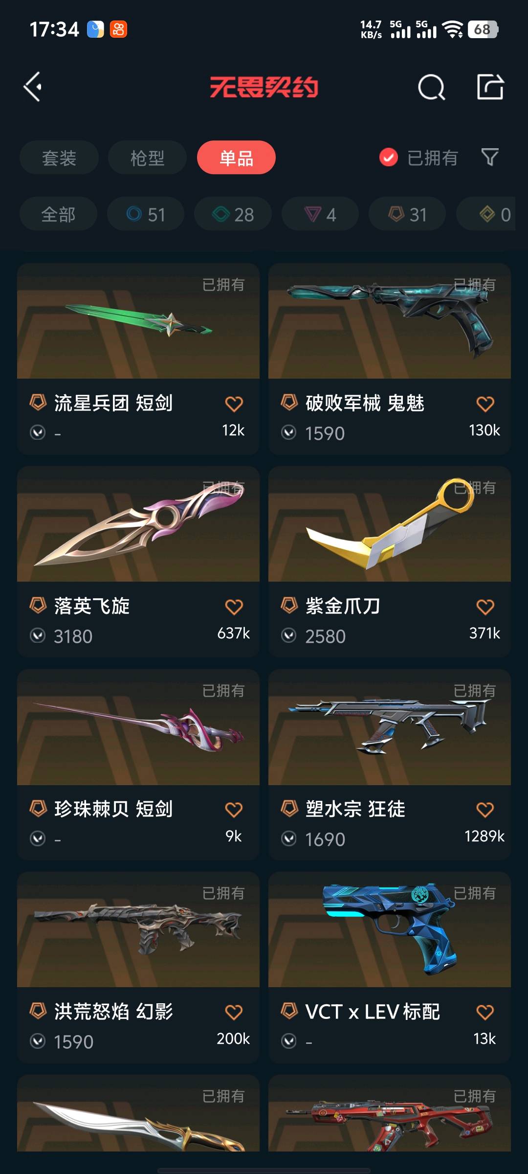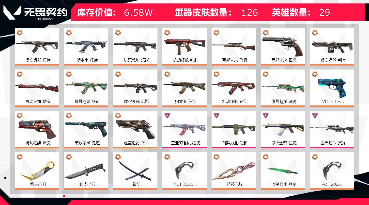 可排位/r点不要用/禁开挂/英雄全有;紫金爪刀,剥皮小刀,镭切,VCT 2025 爪刀,盖亚的复仇 狂徒,虚空遗器 狂徒,侦察力量 幻影,