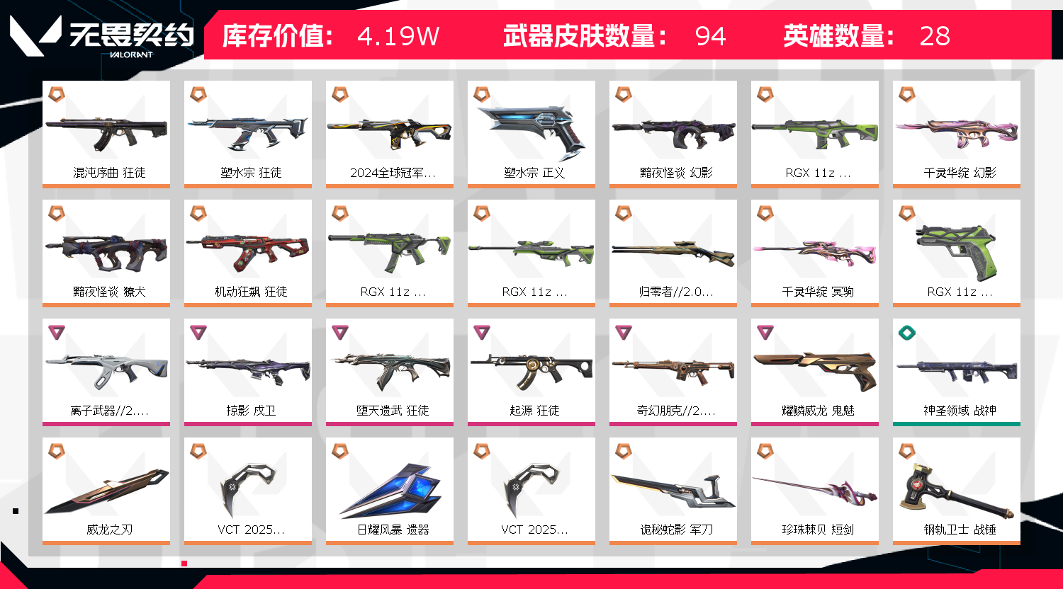 可排位 英雄26 武器皮肤数量74;威龙之刃,VCT 2025 爪刀,掠影 戍卫,堕天遗武 狂徒,混沌序曲 狂徒,塑水宗 狂徒,2024全球冠军赛 幻影,
