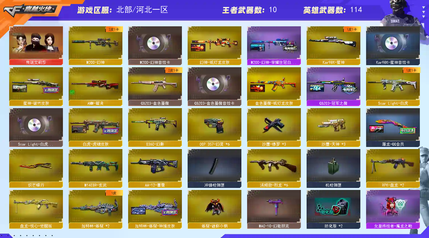 【Lv.102 】VIP5 131V 传说艾丽莎,幻神皮肤+音效卡,星神皮肤+音效卡,白虎皮肤+音效卡 冠军之势,冠军之怒,冠军之武,冠军之薇,冠军之啸,黑骑士冠军AG 主流武器音效卡基本齐全 英雄级4防人物皆已开槽 【温馨提示】绿色游戏。恶意下单维权及检测到外挂将无法再次下单! 【温馨提示】排位比赛请勿中途退出游戏,一经发现拉黑处理。 【温馨提示】如租号时长不足,请勿再开启排位或及时续租,避免禁排,如发现时长不足恶意开启排位,拉黑处理。 【温馨提示】如遇到账号冻结,请申请号主协助,号主三分钟之内会解除。 祝各位文明租号的租客身体健康,万事如意,玩的开心!;炽芒蝶刃,传说艾莉莎,RPK-盘龙,QBZ03-金色蔷薇,G36C-幻影,M200-幻神,Scar Light-白虎,