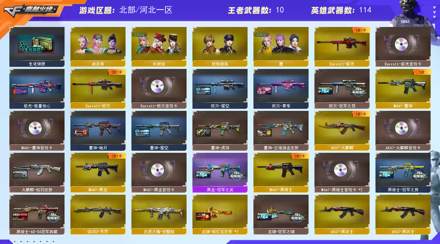 首页 > 租号大厅 > 穿越火线 > 网通区/河北一区 > 爆破|生化全装+传说艾丽莎+幻神三件套+星神三件套+白虎三件套+QBZ三件套+G36C+蝴蝶刀+6烈