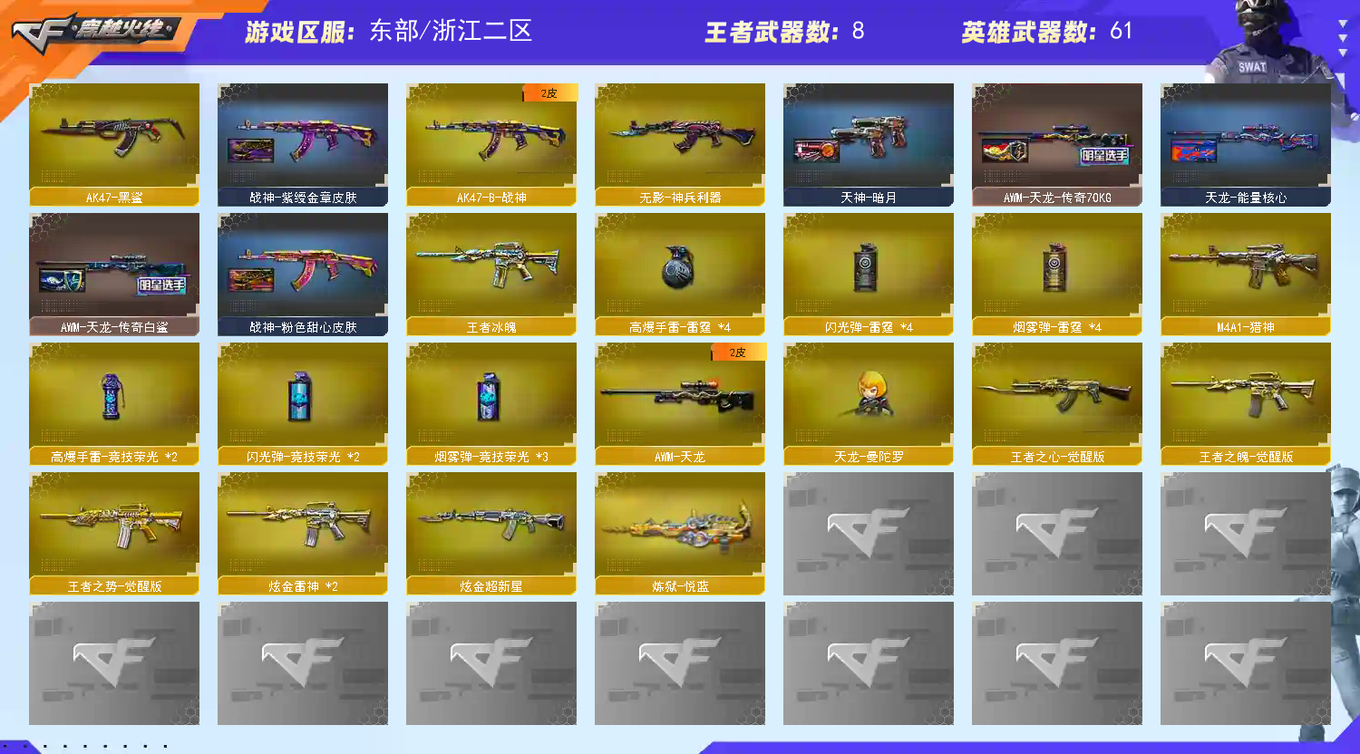 首页 > 租号大厅 > 穿越火线 > 电信区/浙江二区 > 【NB23】幻神白虎丨雷黑毁音效丨荣光柯尔特×2雷霆COP×2虎将伏羲毁灭18赛事炫王者涂鸦