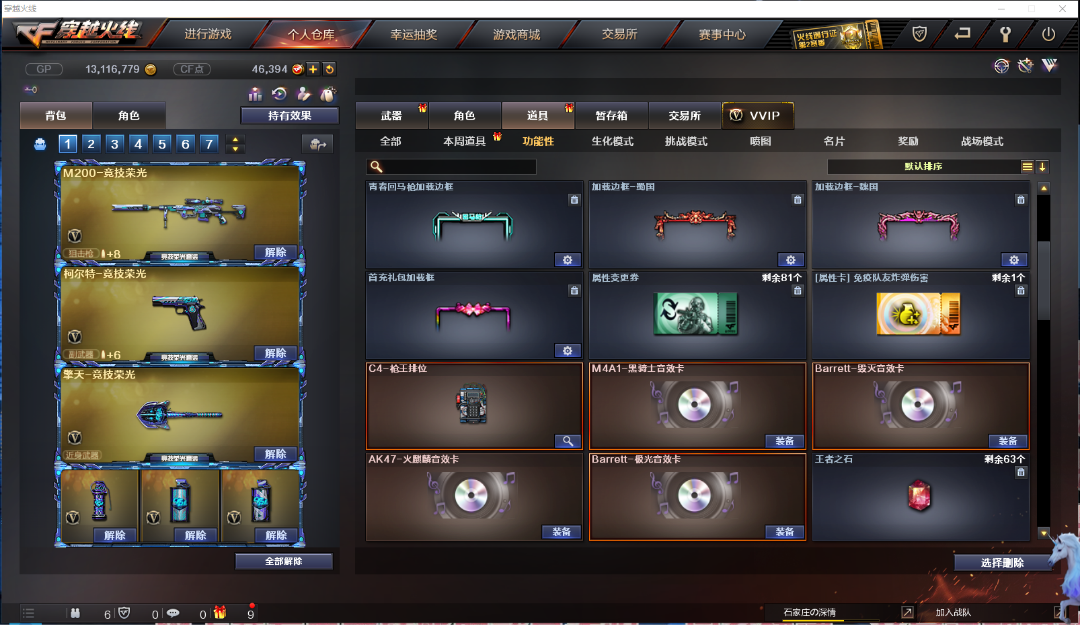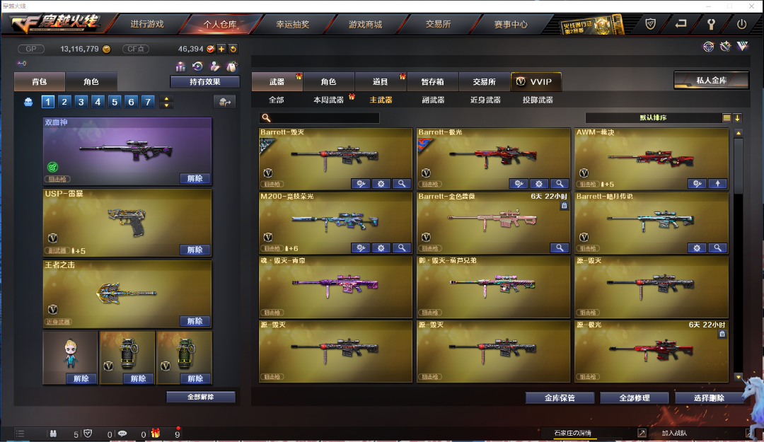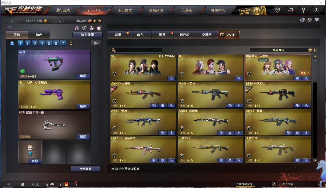 角色:4防电竞教官-云悠悠 四防舞动青春 皮肤:时空猎手-幻影猎人 武器:六盘龙 六烈龙 斯泰尔-蝴蝶 炼狱-风暴 双面神 M200-竞技荣光套装 A180-蓝色骑士 MAC-10-涂鸦 轻型军用手斧镜 道具:生化弹夹 冲峰枪弹夹 机枪弹夹 防护服 夺命之镰 对讲机 闪光镜 变异宝贝;USP-雷暴,电竞教官-云悠悠,RPK-盘龙,QBZ03-金色蔷薇,