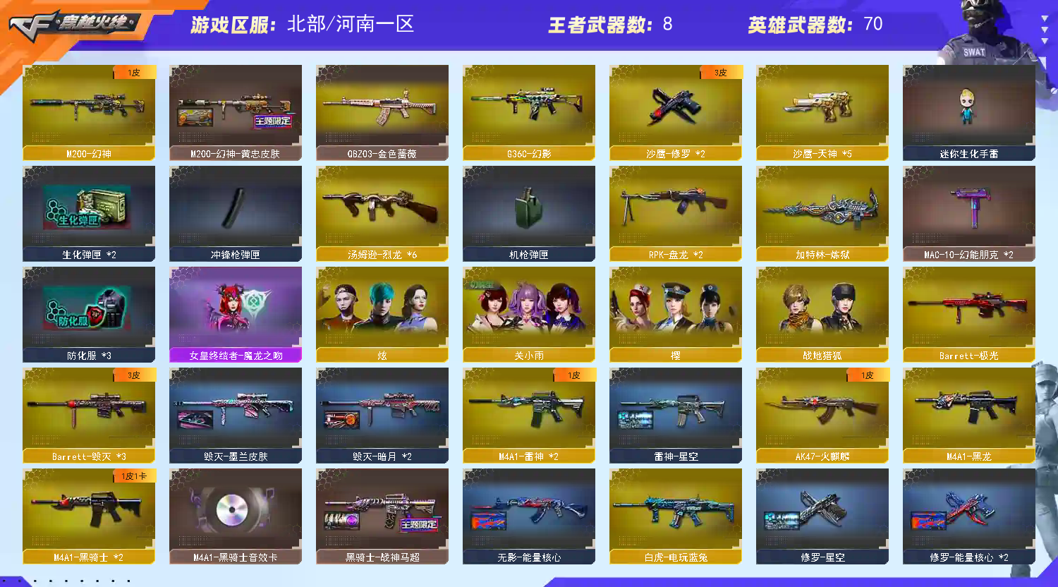 幻神黄忠皮肤|6烈死亡之眼|灵狐者七夕宝贝佣兵觉醒捕食者之眼|白虎电玩蓝兔|雷神死神|无影黑骑士|生化爆破全装号 北部战区合区大区(河北一区、辽宁一区、辽宁二区、辽宁三区、山东一区、山东二区、河南一区、河南二区、北京一区、北京二区、黑龙江一区、北方大区、北京三区、北京四区、吉林一区、山西一区)登录的时候选择河南一区。 【编号】:HN340 【角 色】:CFVIP5、关小雨、樱、炫、初恋灵狐、芳心审判者(捕食者之眼)、灵狐者七夕宝贝(佣兵觉醒无需换弹、捕食者之眼)、8周年戒指、锋芒之环 【主 武】:M200幻神(黄忠)、g36c幻影、烈龙X6、死亡之眼、青龙之魄、王者之心、王者之翼、王者之影、王者之势、王者之光、王者之怒、炫金千变、火麒麟、黑龙、雷神、黑骑士(战神马超、黑骑士音效卡)、无影、死神、玫瑰精灵、猎神、烈火、猩红传说、白虎电玩蓝兔、天龙、毁灭、极光、盘龙、炼狱、金魔等各种活动武器 【副 武】:修罗、天神X4、炫金天神X3、COP小白龙、1911大黄蜂、1911宇航兔、COP神兵利器、MAC涂鸦 【近 身】:云龙扇、屠龙X4、龙啸X3、擎天、麒麟刺X2、尼泊尔雷霆、金刚伞、蝴蝶刀 【投 掷】:雷霆套X4、烟雾弹云龙、闪光弹云龙、惨叫鸡手雷、惨叫迹手雷、凤凰之息、雷蛇手雷、虎牙手雷、黄金刀锋手雷 【道 具】:黑骑士音效卡、7个背包、AC(防弹衣+防弹头盔)、C4工具钳、手雷包、挑战弹夹、夺命之镰、变异宝贝、灵魂忍者、生化弹夹、防化服、机枪弹夹、冲锋枪弹夹、散弹枪弹夹、手枪弹夹、狙击枪弹夹、步枪弹夹、减少停顿包;RPK-盘龙,QBZ03-金色蔷薇,G36C-幻影,M200-幻神,