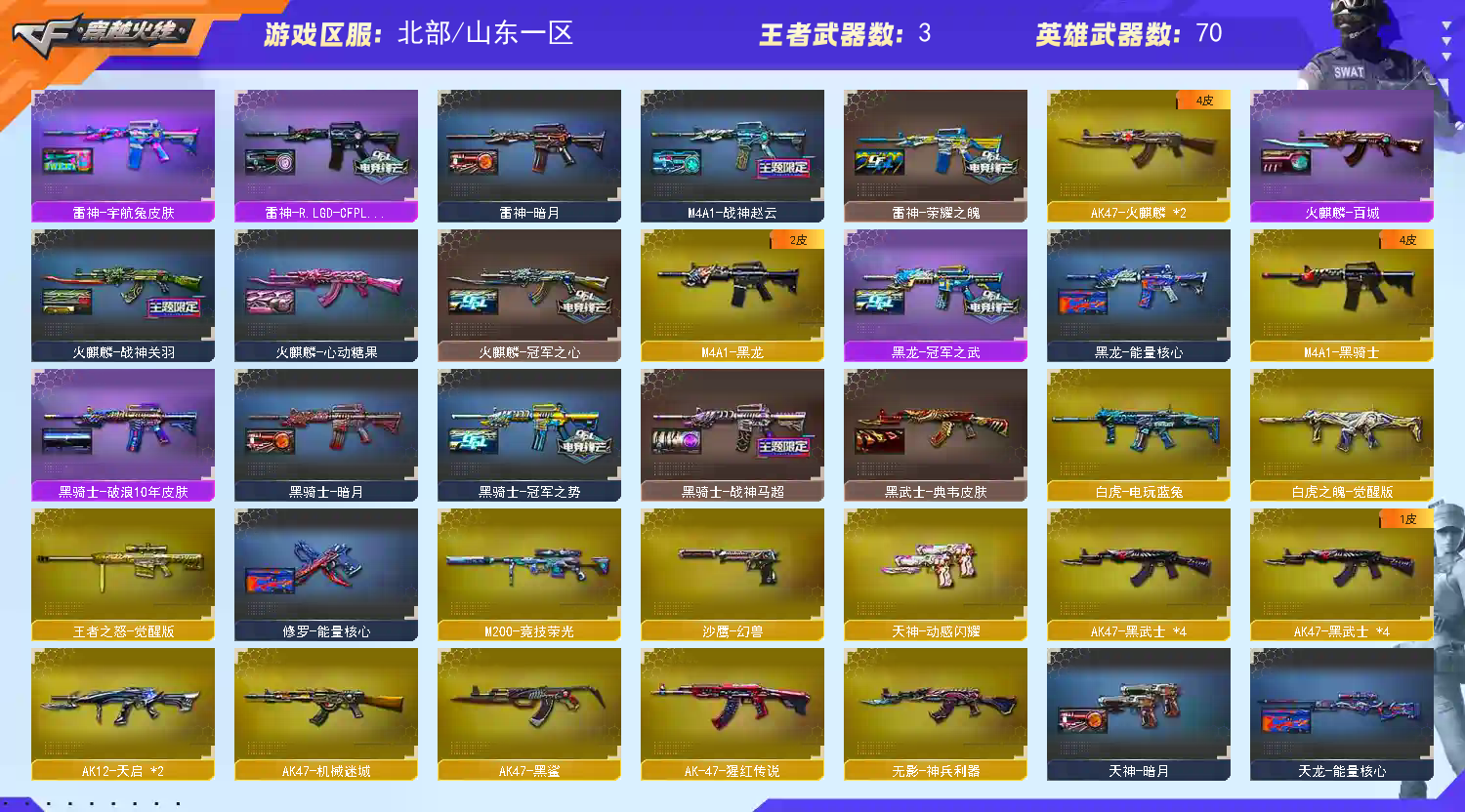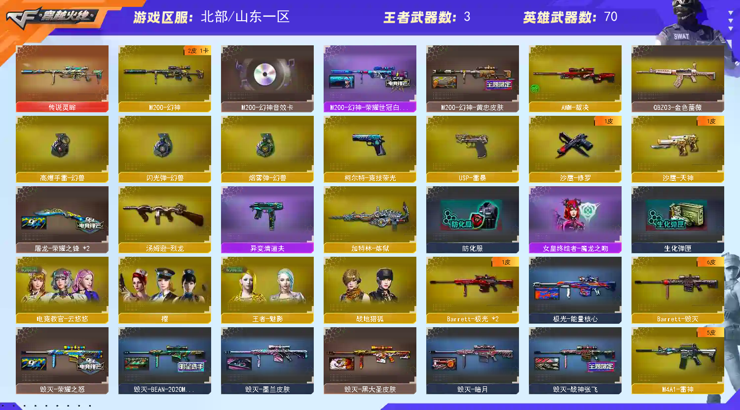北部可排传说灵眸+白鲨黄忠幻神音效卡 白虎之魄 雷神LGD 竞技荣光套 动感闪耀套 王者之怒 王者魅影 雷暴USP 女皇利刃 雷神皮肤 战神赵云 荣耀之魄 雷神LGD 宇航兔兔 暗月 幻神皮肤 黄忠 荣耀白鲨 黑骑士 冠军之势 战神马超 白马银枪 破浪10年 火麒麟 冠军之心 战神关羽 雷神 心动糖果 CFSSTAR 百城 白虎电玩蓝兔 金色蔷薇巴雷特 金色蔷薇QBZ 黑武士 典韦 角色 云悠悠 王者魅影 乔伊教练;USP-雷暴,电竞教官-云悠悠,QBZ03-金色蔷薇,M200-幻神,传说灵眸,