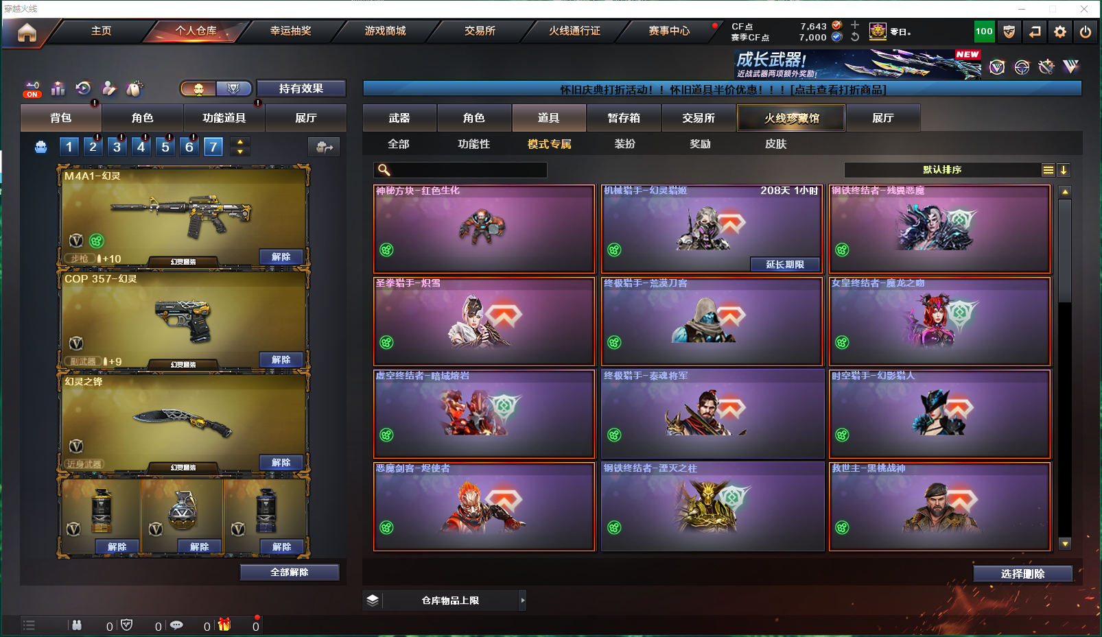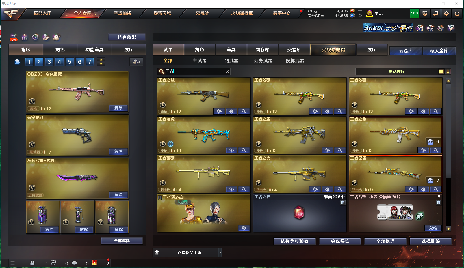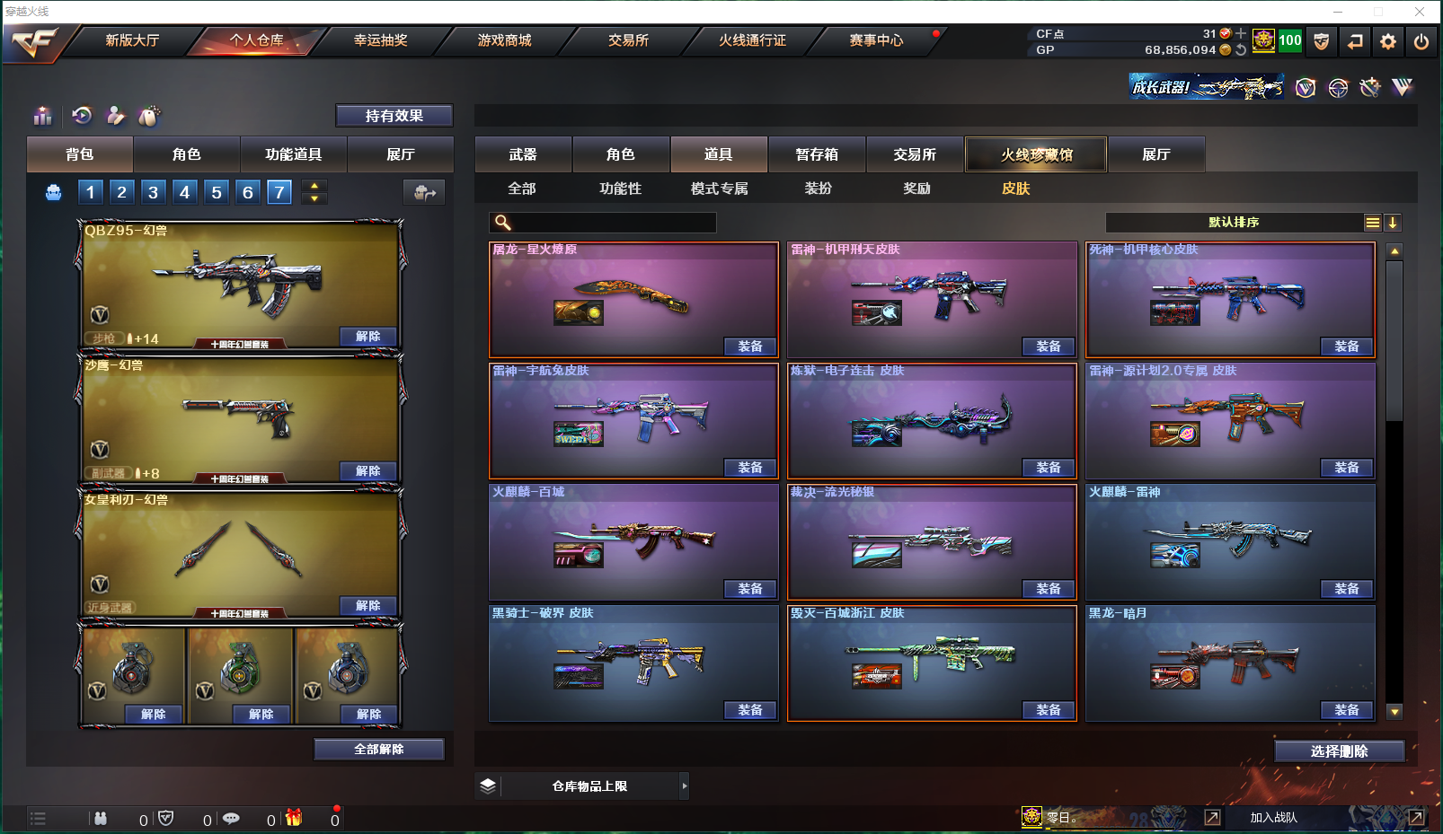 【4传说】:传说影煞、传说灵眸、传说梦魇、传说破晓 【生化】:传说灵眸(打生化的神狙)、炽芒蝶刃*2(蝴蝶刀,生化加速神刀,最帅的耍酷刀)、斯泰尔-幻面灵狐、斯泰尔-蝴蝶、异变清道夫、毒蜂、死亡之眼、双面神、 (时空猎手-幻影猎人、钢铁终结者-残翼恶魔、圣拳猎手-炽雪、恶魔剑客-烬使者、钢铁终结者-湮灭之柱、终极猎手-秦魂将军、虚空终结者-暗域熔岩、女皇终结者-魔龙之吻、救世主-黑桃战神、时空猎手-幻影猎人、终极猎手-荒漠刀客、) 迷你生化手雷、生化手雷-小钢、生化手雷、生化手雷-机甲核心、雄黄酒手雷、 迷雾幽灵、妖姬、疯狂宝贝、绿色巨人、变异宝贝、灵魂忍者、夺命之镰、生化弹匣、防化服、减少停顿道具(不退包)、6盘6烈6炼 传说影煞(佣兵觉醒:无需装弹、生化觉醒:狂暴化、捕食者之眼、生化背包变更) 影豹(佣兵觉醒:无需装弹、生化觉醒:狂暴化、移动速度提升、生化背包变更) 王者潘多拉(佣兵觉醒:无需装弹、捕食者之眼、生化防化服、生化背包变更) 【皮肤】:雷神-机甲刑天皮肤、屠龙-星火燎原、死神-机甲核心皮肤、雷神-源计划2.0专属皮肤、炼狱-电子连击皮肤、裁决-流光秘银、炼狱-迷彩皮肤、火麒麟-百城、裁决-运输船皮肤、雷神-宇航兔皮肤、火麒麟-雷神、毁灭-神秘黑洞皮肤、屠龙-惊鸿皮肤、黑龙-暗月、炼狱-玩具枪皮肤、死神-秘银、火麒麟-心动糖果、黑骑士-破界皮肤、毁灭-虹光风暴皮肤、毁灭-百城浙江皮肤、雷神-动感闪耀皮肤、AK47老兵传说皮肤、毁灭-黑大圣皮肤、毁灭-英雄计划皮肤、火麒麟-AG战队皮肤、屠龙-春桃皮肤、火麒麟-平天大圣、龙啸-青青莓果皮肤、裁决-胜者为王皮肤、修罗-CFSTAR、火麒麟-CFSTAR、天龙-CFSTAR、 (修罗-能量核心、无影-能量核心、黑龙-能量核心、雷神-能量核心、极光-能量核心、天龙-能量核心、) 【王者】:王者凌虎(觉醒版,有英雄武器属性)、王者星霆(觉醒版,有英雄武器属性)、王者之圣、王者之势、王者芳薇*2(觉醒版,有英雄武器属性)、王者蔷薇(觉醒版,有英雄武器属性)、王者之城(觉醒版,有英雄武器属性)、王者之光(觉醒版,有英雄武器属性)、炼狱-悦蓝*6(觉醒版,有英雄武器属性,有子弹加成)、王者潘多拉 【音效卡】:AWM-昌龙-怀旧音效卡、死神-雪域霜狐-怀旧音效卡、烈龙-云海游龙音效卡、炼狱-百战金芒-庆典舞曲音效卡、修罗-云海游龙音效卡、白虎-盛典舞曲音效卡、擎天-云海游龙音效卡、天神-动感闪耀音效卡、Barrett-碧霄极光音效卡、烈火-动感闪耀音效卡、屠龙-电竞之星-竞星跃动音效卡、屠龙-云海游龙音效卡、HK417-朱雀-电竞之星-竞星跃动音效卡、;炽芒蝶刃,传说影煞,RPK-盘龙,QBZ03-金色蔷薇,传说灵眸,Kar98K-星神,