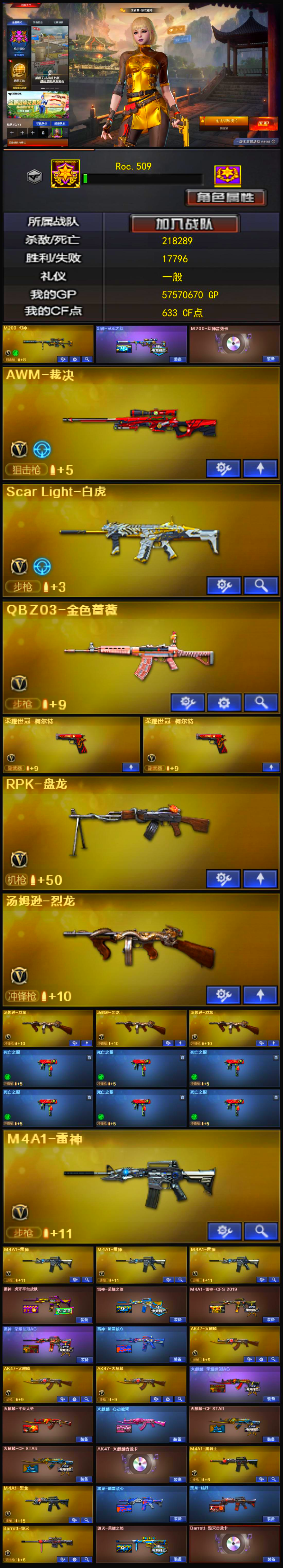 可排位/M200-幻神+音效卡+冠军之幻/白虎+QBZ蔷薇+满副极品爆破生化号;荣耀世冠-柯尔特,RPK-盘龙,QBZ03-金色蔷薇,M200-幻神,Scar Light-白虎,