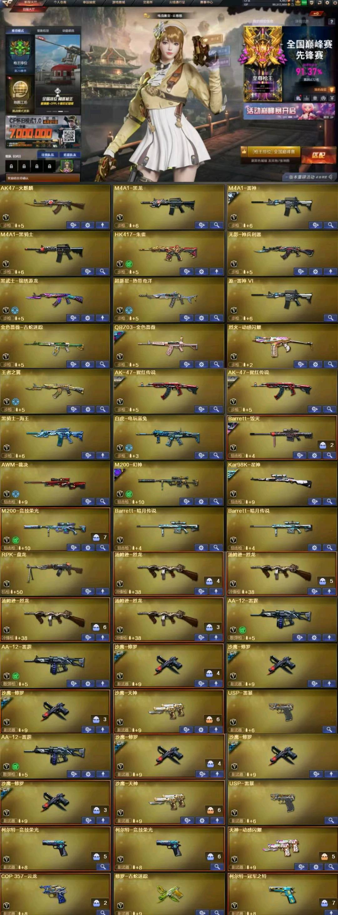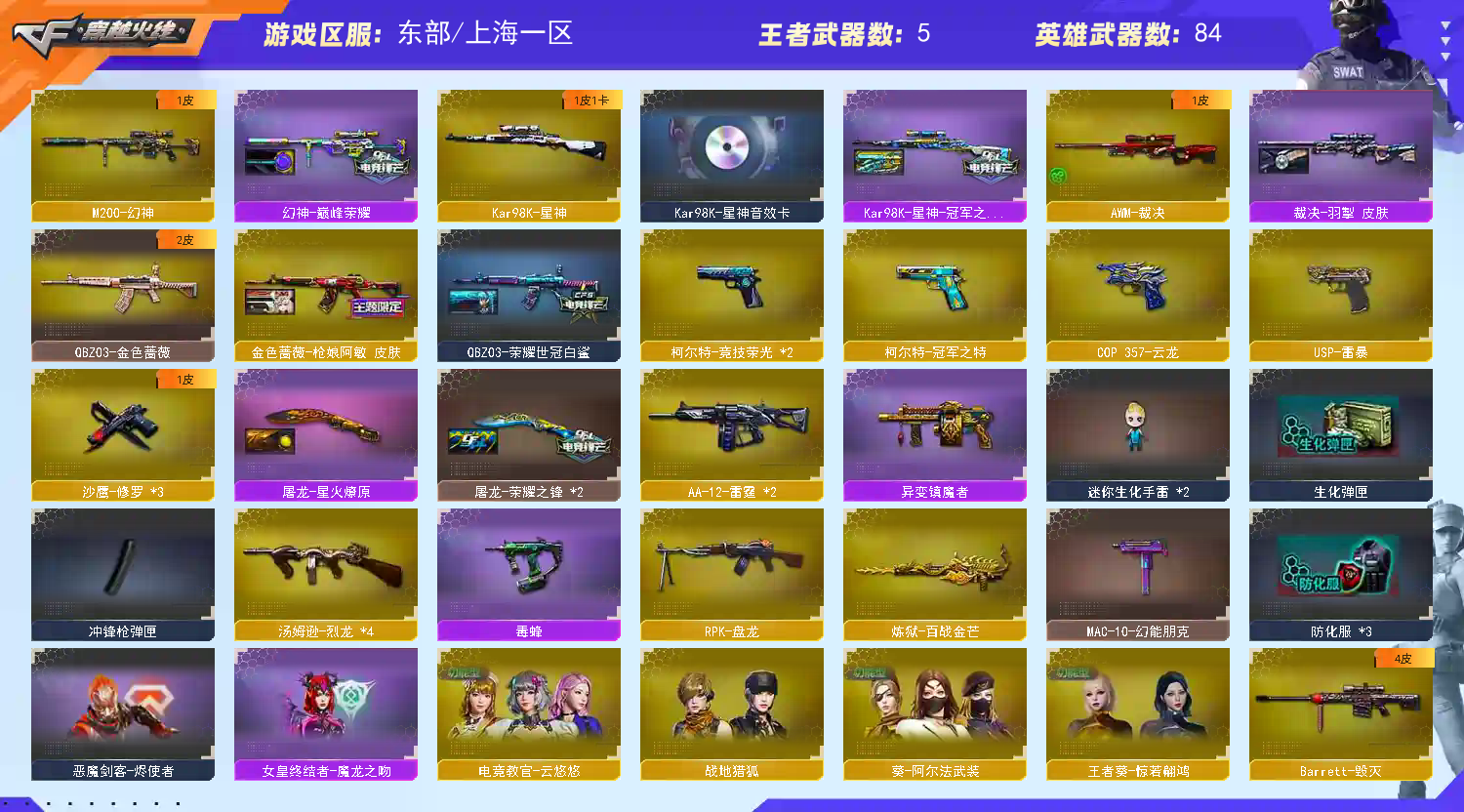 此账号和平台是合作账号,违反规定封号等因素,直接联系平台方永久冻结您ip;USP-雷暴,柯尔特-冠军之特,电竞教官-云悠悠,RPK-盘龙,QBZ03-金色蔷薇,M200-幻神,Kar98K-星神,