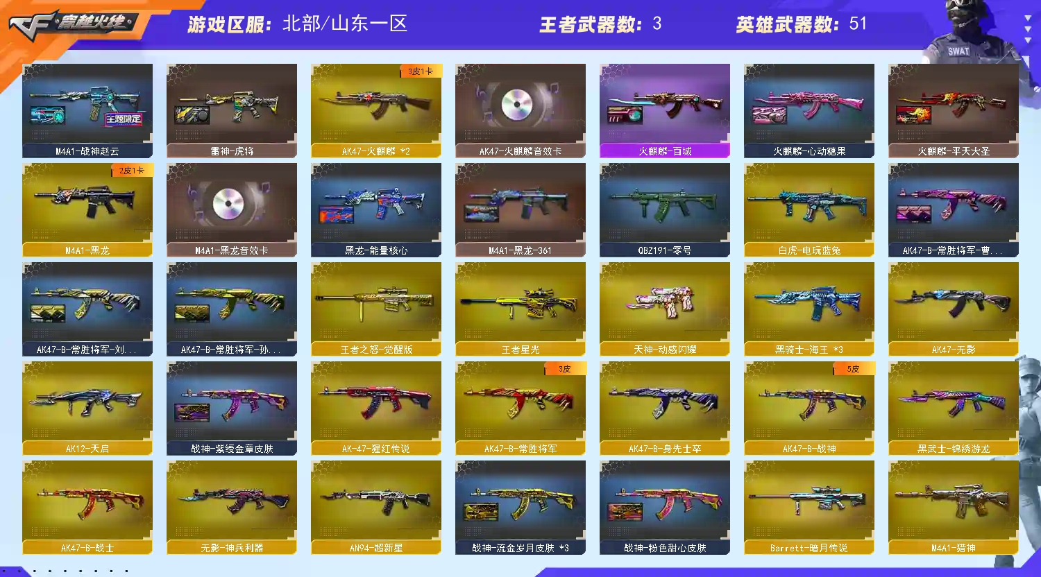 M200幻神音效卡|6烈龙斯太尔蝴蝶|白虎电玩蓝兔|QBZ金色蔷薇|雷神黑龙|毁灭火麒麟|生化爆破全装号 北部战区合区大区(河北一区、辽宁一区、辽宁二区、辽宁三区、山东一区、山东二区、河南一区、河南二区、北京一区、北京二区、黑龙江一区、北方大区、北京三区、北京四区、吉林一区、山西一区)登录的时候选择山东一区。 【编号】:SD322 【角 色】:CFVIP6、枪娘樱、乔伊教练、王者葵貂蝉、修道士、樱、初恋灵狐、芳心审判者、空、双蛇戒指、8周年戒指 【主 武】:M200幻神(幻神音效卡)、烈龙X6、斯太尔蝴蝶、王者之怒、火麒麟(CFSTAR、AG战队、火麒麟音效卡)、黑龙(黑龙音效卡)、雷神(战神赵云、雷神音效卡)、无影、天启、超新星、龙血、无影神兵利器、烈火动感闪耀、QBZ金色蔷薇(枪娘阿敏、QBZ音效卡)、猎神、猩红传说、战士、战神、黑骑士海王、身先士卒、常胜将军、白虎电玩蓝兔、天龙(CFSTAR)、毁灭(毁灭音效卡)、极光、Barrett暗月传说、盘龙X2、炼狱、金魔等各种活动武器 【副 武】:修罗X3、天神X2、天神动感闪耀、王者之灵、炫金修罗、阐释者、COP神兵利器、 1911大黄蜂、1911小故障 【近 身】:屠龙、龙啸、擎天、麒麟刺、屠龙动感闪耀、龙啸烈火龙威、金刚伞、双龙、不灭之拳、蝴蝶刀、猫猫手套 【投 掷】:动感闪耀手雷、惨叫鸡手雷、音乐手雷、惨叫迹手雷、凤凰之息、大乔手雷、麒麟手雷 【道 具】:火麒麟音效卡、雷神音效卡、黑龙音效卡、QBZ金色蔷薇音效卡、幻神音效卡、毁灭音效卡、7个背包、AC(防弹衣+防弹头盔)、C4工具钳、手雷包、挑战弹夹、夺命之镰、变异宝贝、灵魂忍者、生化弹夹、防化服、机枪弹夹、冲锋枪弹夹、散弹枪弹夹、手枪弹夹、狙击枪弹夹、步枪弹夹、减少停顿包;RPK-盘龙,QBZ03-金色蔷薇,M200-幻神,