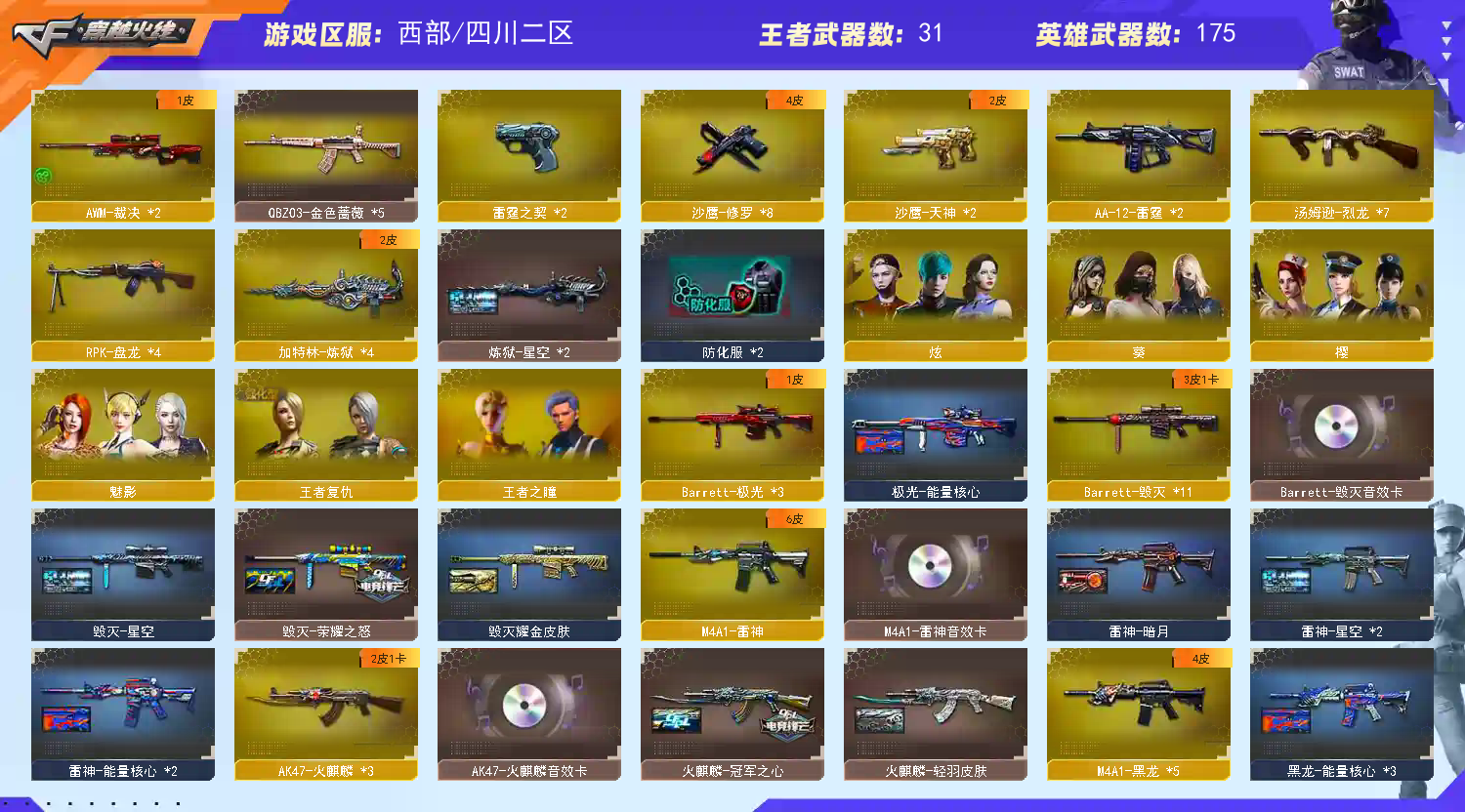 195V42王者|6烈6机枪|3音效卡|全套雷霆套装|冠军之心荣耀之怒AG战队霓裳冠军之心荣耀之怒AG战队霓裳耀金星空等皮肤|生化爆破挑战全装号 西部战区合区大区(四川一区、四川二区、重庆一区、陕西一区、云南一区)登录的时候选择四川二区。 SC182 【角 色】:大校等级、王者之瞳、王者复仇、魅影、炫、樱、葵、青霞仙子(生化/佣兵觉醒)、雅典娜、烟雾保护头盔、闪光护目、超级背包、双龙戒指、双蛇戒指 【主 武】:Barrett朱雀、烈龙X7、死亡之眼、盘龙X4、加特林炼狱X4(星空)、M4A1雷霆、Barrett雷霆、王者之心X3、王者之翼X2、王者之影、王者之鲨、王者之幻、王者之戮、王者之魄(觉醒)、王者之势X3(觉醒)、王者之武X3、王者之光X3、王者之力X2(觉醒)、王者之怒X2、炫金超新星X2、炫金黑龙X3、炫金雷神、炫金骑士、炫金千变、炫金天龙、雷神精英刀锋、超新星悦享、千变、火麒麟X8(音效卡、AG战队、CFSTAR、轻羽、冠军之心)、黑龙X5(361、暗月、能量核心)、雷神X5(音效卡、暗月、能量核心、星空)、黑骑士X3(耀金)、无影X5(能量核心、耀金、霓裳)、死神X2、黑武士X6、天启X4、超新星、武圣、机械迷城X5、黑鲨、龙血X5、玫瑰精灵X2、QBZ03金色蔷薇X5、猎神、烈火、AK47-猩红传说X9(老兵传说皮肤)、AK47-B-战士X2、黑武士CF网剧冠军武器套装X2、天龙X2(传奇70KG、传奇白鲨、CFSTAR)、毁灭X11(音效卡、荣耀之怒、耀金、星空)、极光X3(能量核心)、裁决X2、Barrett金色蔷薇X3、Barrett暗月传说、AA12雷霆X2、巨龙咆哮3、神圣爆裂者3 【副 武】:炫金修罗X2、王者之魂X3(觉醒)、天神CF网剧冠军武器套装X2、COP雷霆X2、天神X2(暗月)、修罗X7(星空、能量核心、CFSTAR)、1911大黄蜂、凤凰之火、胜利之火、COP357迷彩 【近 身】:王者之啸、擎天CF网剧冠军武器套装X2、尼泊尔雷霆、麒麟刺X8、擎天X7、龙啸X4、屠龙X9、伪装、黄金充气大锤、干将莫邪、断离、千变灵蛇、斩神刀、迷你牛牛 【投 掷】:雷霆手雷套装X8、迷你生化手雷、音乐手雷、胜利之光 【道 具】:雷神音效卡、毁灭音效卡、火麒麟音效卡、火麒麟玩偶、幸运鼠玩偶、关羽玩偶X2、王者刀锋玩偶X2、敖丙玩偶、哪吒玩偶、暴躁猪猪玩偶、审判者玩偶、14个背包、AC套(防弹衣-防弹头盔)、夺命之镰、生化弹夹、防化服、C4工具钳、手雷包、挑战弹夹、步枪弹夹、冲锋枪弹夹;RPK-盘龙,QBZ03-金色蔷薇,