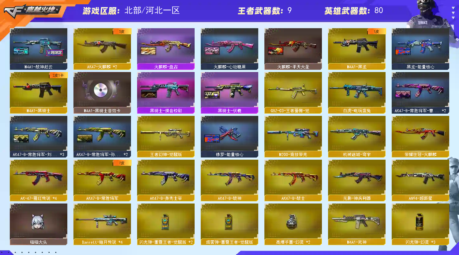王者幻神 王者蔷薇 王者烈火 王者冰魄 王者火魄传说圣灵 白虎 电玩蓝兔-白虎 荣耀世冠-火麒麟 柯尔特-冠军之特 竞技荣光套装 金色蔷薇+音效卡 六烈龙+斯太尔蝴蝶 雷神+音效卡+宇航兔皮肤+烈虎皮肤+战神赵云皮肤 黑骑士+音效卡+皮肤 毁灭+音效卡+冠军之怒皮肤+风暴皮肤死神 超新星 防弹头盔+防弹衣+手雷包+C4钳子+步枪弹夹 人物-电竞教官云悠悠 王者葵-惊若翩鸿 修道士 王者貂蝉 王者玲珑 如果账号异常 可申请售后 会及时处理!! 感觉账号体验感不错 请点击收藏 以防迷路!!!;USP-雷暴,柯尔特-冠军之特,电竞教官-云悠悠,RPK-盘龙,QBZ03-金色蔷薇,Scar Light-白虎,