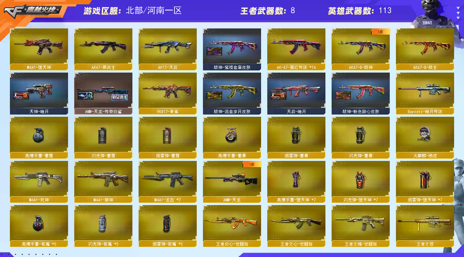 北部号 113V🔥幻神/朱雀/青龙🔥夜魔/堕天神套装🔥孔明/传奇白鲨/荣耀/暗月/星空/能量核心皮【河南一区登录】【炫金稀有顶1V介意者勿租】【恶意投诉、撤单不想玩了租错号了等非帐号问题1律拉黑】【此号已备案请勿以身试法】【开挂必究账号价值超高】详细武器请看下方 【重要套装】堕天神套装/夜魔套装 【重要角色】审判者/_迷迭香/雅典娜/铁骑荣耀/空/灵狐者-黄金海岸 【英雄武器】_M200-幻神/Barrett-毁灭(2)/Barrett-极光/Barrett-暗月传说/王者之怒-觉醒版/AWM-天龙/M4A1-堕天神/M4A1-青龙/M4A1-雷神/M4A1-死神/M4A1-黑龙/M4A1-龙血(2)/M4A1-千变/M4A1-黑骑士(2)/M4A1-夜魔/M4A1-猎神/M4A1-玫瑰精灵/王者之魄-觉醒版/HK417-朱雀/AK12-天启/AK47-火麒麟(2)/王者炎心-觉醒版/AK47-黑武士/AK-47-猩红传说(14)/AK47-B-战士/AK47-B-战神/QBZ03-金色蔷薇/王者之心-觉醒版/9A91-烈火/汤姆逊-烈龙(7)/COP-堕天神(2)/沙鹰-天神/沙鹰-修罗(5)/破空枪刃-夜魔/麒麟刺(2)/麒麟刺-堕天神/龙啸/龙啸-堕天神/王者之啸-觉醒版/擎天/屠龙(4)/雷霆之锋/马来剑-夜魔/斩神刀-雷暴/高爆手雷-雷暴/高爆手雷-雷霆/高爆手雷-夜魔(5)/高爆手雷-堕天神(7)/烟雾弹-雷暴/烟雾弹-雷霆/烟雾弹-夜魔(5)/烟雾弹-堕天神(7)/闪光弹-雷暴/闪光弹-雷霆/闪光弹-夜魔(5)/闪光弹-堕天神(7) 【王者武器】王者之怒/炼狱-悦蓝 【小人枪】火麒麟-绝迹/巴雷特-零-水下丽影/AWM-灵狐-15周年嘉年华/M37-葵/COP-旗袍/魔能飞环-曼陀罗/闪光弹-小乔 【其他重要武器】炫金骑士/炫金黑龙/炫金雷神/炫金毁灭(2)/黑骑士-摸金校尉(2)/黑武士-能量核心(2)/M4A1-英雄-能量核心/火麒麟-暗月/M4A1-仙界-黑骑士/M4A1-十二生肖·龙-雷神(2)/激光毁灭者III/AK47-B-十周年/M14EBR-情人节2020/火麒麟-桃园结义/AK47-SS-枪王排位/M4A1-SS-枪王排位(2)/M4A1-Guitar 炫彩/联想锋行黄金AK/M4A1-电音/海浪AK47-Q浏览器/AT15-万圣节/M4A1-PINK/AK12-枪王排位/M4A1-紫狱(3)/黄金AK-47(2)/G3A3-SS-枪王排位/AK47-破空冰刃/M4A1-破空冰刃/HK417-赤龙/AK-47-二次元(2)/M4A1-秘银赤龙(5)/AK47-轮回/AK-103-红色悦动/AK47-枪娘/AK47-绚樱/M4A1-樱花/AK47-十二生肖-蛇/AK47-狂欢-CFS/9A91-蓝色骑士/AK-12-CFS2017纪念版/雷神-赛博朋克(2)/AK47-娜塔莎/金色小号/M200-赤血龙魂/98K-烛龙/暗金M200(2)/AWM-蓝水晶/AWM-Pink/AWM-2018圣诞/AWM-A(2)/M200-万圣节2018/蓝色魅影/AWM-圣诞/M200-牡丹/AWM-涂鸦/AWM-卡通/M200-大黄蜂(3)/98K-炫彩/M200-圣诞/暗金AWM(2)/AWM-恶棍-枪王排位/AWM-万圣节刀锋/AWM-S/Barrett-翔龙/AWM-恶棍/KAC-耀龙/EVO III-赤血龙魂/斯太尔-能量核心/Spas-12-黑金/新USP-枪王排位奖励(3)/幻影沙鹰-枪王排位(2)/COP 357--绚樱(4)/Cop357-赤龙/沙鹰-枪王排位(3)/修罗-摸金校尉/沙漠之鹰-炎龙/愤怒公牛左轮-枪王排位(2)/COP 357-子鼠/Anaconda-黑金神龙/沙鹰-青龙/Anaconda-炽焰核心/丛林匕首-卧龙(4)/军用手斧-能量核心/蝴蝶刀-枪王排位/虹光丛林匕首-枪王排位/幻影扳手-枪王排位/猫猫手套(2)/斩神刀-御龙/胜利奖杯烟雾弹-枪王排位(2)/胜利奖杯闪光弹-枪王排位/手雷-能量核心(2)/闪光弹-枪王排位(2)/红色诅咒娃娃手雷 【重要武器皮肤】毁灭-荣耀之怒/毁灭-暗月/极光-能量核心/AWM-天龙-传奇白鲨/火麒麟-CFSTAR/火麒麟-AG/无影-暗月/AK-47-雷神/M4A1-千变-孔明皮肤/雷神-荣耀之魄/雷神-暗月/雷神-能量核心/雷神-星空/黑龙-暗月/黑龙-能量核心/M4A1-黑龙-361/天启-暗月/战神-流金岁月皮肤/战神-紫绶金章皮肤/战神-粉色甜心皮肤/修罗-能量核心/天神-暗月 【重要光效】Barrett-毁灭金色光效/炼狱-悦蓝金色光效/王者之影金色光效/王者之怒金色光效/王者之锋金色光效/王者之魂金色光效/AK47-火麒麟蓝色光效/AK47-黑武士蓝色光效/AN94-超新星蓝色光效/AWM-天龙蓝色光效/RPK-盘龙蓝色光效/屠龙蓝色光效/巴雷特-毁灭蓝色光效/沙鹰-修罗蓝色光效/麒麟刺蓝色光效/龙啸蓝色光效/AK12-天启红绿光效/M4A1-玫瑰精灵红绿光效/M4A1-雷神红绿光效 【重要音效卡】M4A1-黑骑士音效卡/M4A1-雷神音效卡/Barrett-毁灭音效卡 【重要戒指】8周年戒1/8周年戒2/15周年限定戒指/龙眼(死神)/龙眼(鹰)/金蛇戒/16赛季纪念戒指-枪王耀金/17赛季纪念戒指-耀金/18赛季纪念戒指-耀金/20赛季纪念戒指-耀金/21赛季纪念戒指-耀银(拇指)/22赛季纪念戒指-耀铜(食指)/22赛季纪念戒指-耀银(拇指)/23赛季纪念戒指-耀银(拇指)/24赛季纪念戒指-耀银(拇指) 【拥有重要玩偶】黄金幸运猪猪玩偶;QBZ03-金色蔷薇,M200-幻神,