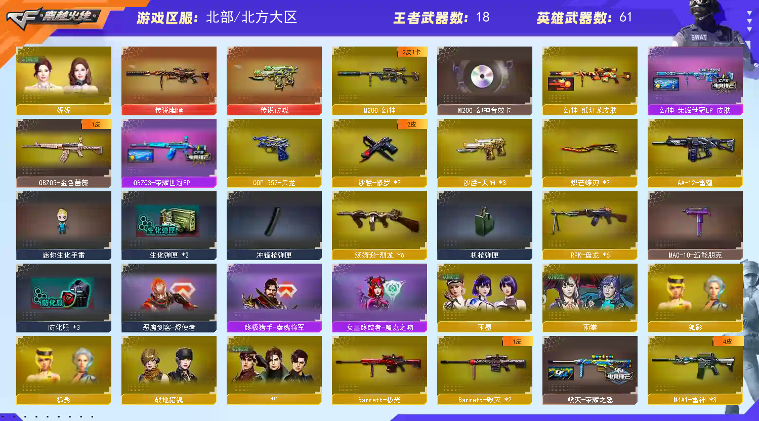 生化爆破挑战三全装 全装弹夹 王者星霆 王者风神 已觉醒 cop云龙 Hk417朱雀 幻神蓝粉 紫橙光效 两把蝴蝶刀 6盘炼狱+6烈蛇隐宗生化5属性角色!! 挑战9阶段buff+168金狐套 大区是北部战区里边的北方大区 老板选区时请注意 三个英雄角色 欢迎老板下单!!;炽芒蝶刃,妮妮,RPK-盘龙,QBZ03-金色蔷薇,传说幽瞳,M200-幻神,
