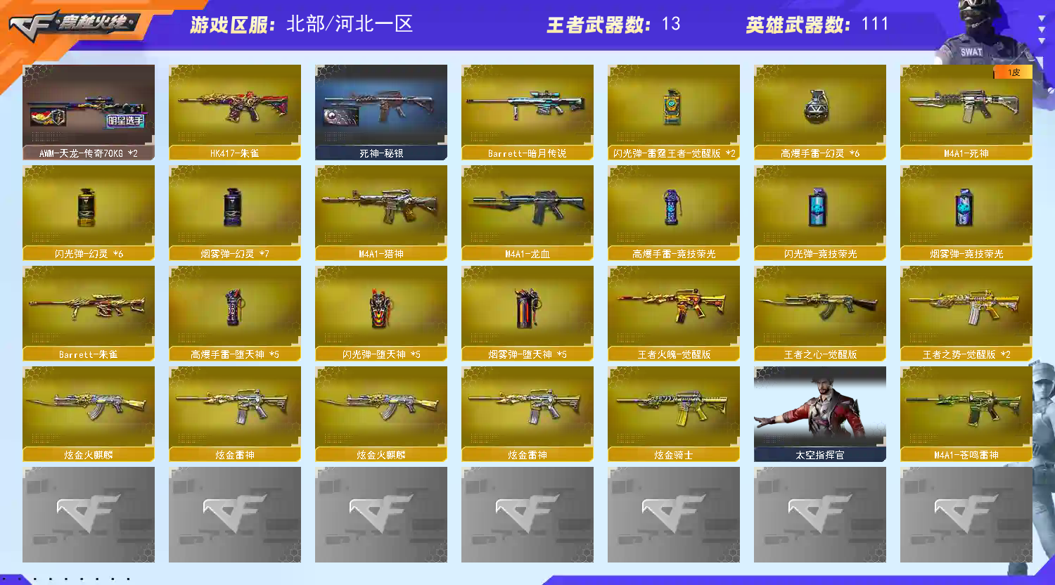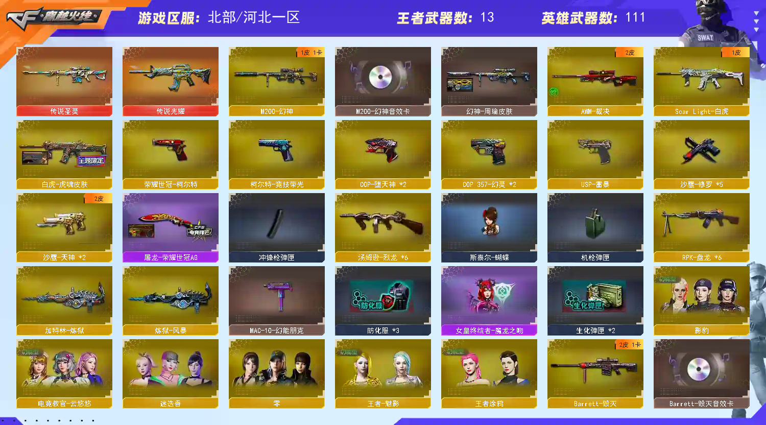 传说圣灵光耀|幻神周瑜皮肤音效卡|110V6烈蝴蝶6盘炼狱|朱雀青龙白虎堕天神竞技荣光荣耀世冠套装|生化爆破全装 北部战区合区大区(河北一区、辽宁一区、辽宁二区、辽宁三区、山东一区、山东二区、河南一区、河南二区、北京一区、北京二区、黑龙江一区、北方大区、北京三区、北京四区、吉林一区、山西一区)登录的时候选择河北一区。 【编号】:HHB338 【角 色】:云悠悠、零、迷迭香、王者魅影、王者涂鸦、影豹、风暴女、救世主-X、蜀雪、铁骑荣耀、影舞者-X、8周年戒指、双蛇戒指、双龙戒指 【主 武】:传说圣灵、传说光耀、幻神(周瑜)、幻神竞技荣光、6烈蝴蝶、6盘炼狱、朱雀、白虎(虎啸)、幻灵、堕天神、青龙、荣耀世冠火麒麟、荣耀世冠雷神、火麒麟X2(盘古、AG、STAR)、黑龙(能量核心)、雷神(冠军之魄)、黑骑士X2(暗月)、死神(秘银)、天启、超新星、黑鲨、龙血、毁灭(风暴)、Barrett朱雀、Barrett暗月传说、毁灭征服者、冰龙粉碎者、机甲撕裂者、激光毁灭者、圣炎切割者、深渊巨龙咆哮、神圣爆裂者、试炼破坏者、苍雷、金魔等各种活动武器 【副 武】:荣耀世冠柯尔特、柯尔特竞技荣光、COP幻灵X2、COP堕天神X2、USP雷暴、修罗X5、天神(暗月)、天神动感闪耀、阐释者、COP小青龙、胜利之火、大黄蜂 【近 身】:屠龙(AG)、擎天、麒麟刺、麒麟刺堕天神、龙啸堕天神、幻灵之锋、擎天竞技荣光、荣耀世冠龙啸、猫猫手套、激光短刃、冰火魔拳 【投 掷】:堕天神套装X5、幻灵套装X6、竞技荣光套装、迷你生化手雷、深渊终结者手雷、胜利之光、高爆手雷-雷蛇、高爆手雷-SS 【道 具】:黑骑士音效卡、雷神音效卡、毁灭音效卡、幻神音效卡、关羽玩偶、小兔姬玩偶、孙悟空玩偶、妖姬玩偶、火麒麟玩偶、7个背包、AC(防弹衣+防弹头盔)、C4工具钳、手雷包、挑战弹夹、夺命之镰、变异宝贝、灵魂忍者、生化弹夹、防化服、机枪弹夹、冲锋枪弹夹、散弹枪弹夹、手枪弹夹、狙击枪弹夹、步枪弹夹、减少停顿包;USP-雷暴,荣耀世冠-柯尔特,电竞教官-云悠悠,RPK-盘龙,M200-幻神,Scar Light-白虎,
