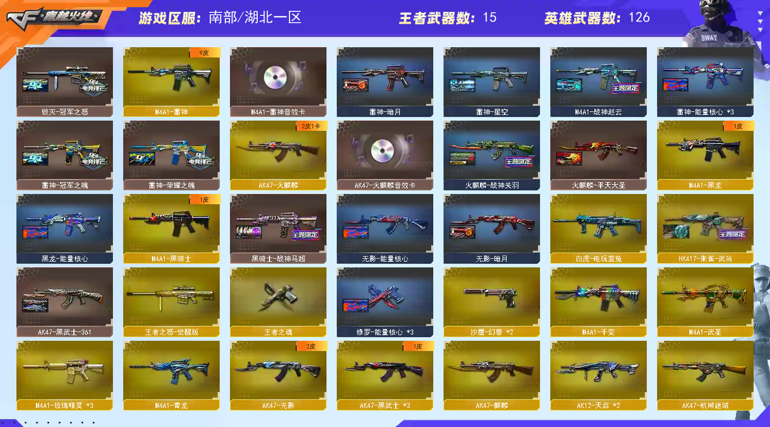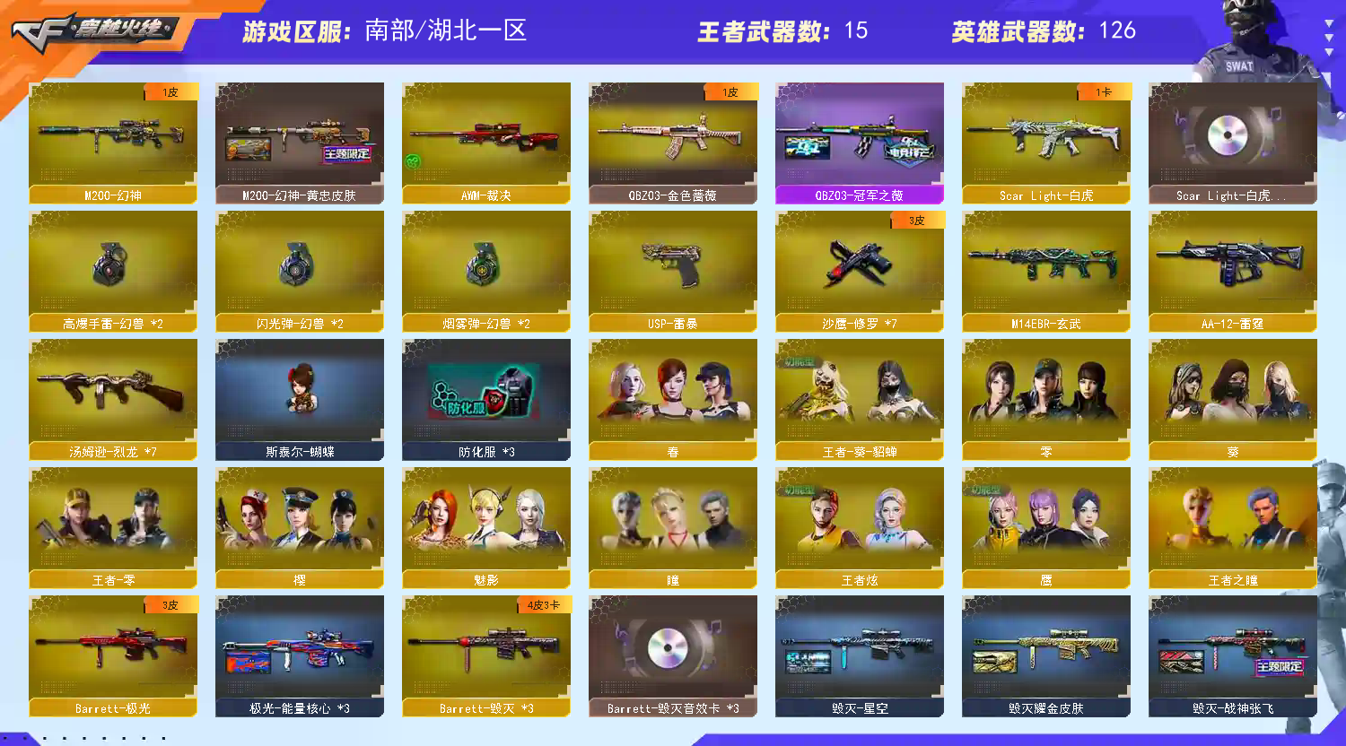 【m200幻神+黄忠+usp雷暴】【6烈龙 斯太尔蝴蝶】【scar白虎+卡】【qbz金色蔷薇+冠军之薇】【hk417朱雀+武当】【玄武】【火麒麟+卡+呛娘皮肤】【黑龙】【雷神+卡+战神赵云+冠军之魄+荣耀之魄】【黑骑士+战神马超】【毁灭+卡+战神张飞+冠军之怒】【极光】【裁决】 【武器:黑武士 天启 超新星 武圣 雷暴 青龙 王者之心 王者之影 王者之翼 王者之武 王者之魄 王者之势 王者之烈 白虎电玩蓝兔 天龙 王者之怒】 【手呛:修罗*7 沙鹰天神*3 沙鹰幻兽*2】 【刀具:屠龙*7 龙啸*2 擎天 麒麟刺*3 尼泊尔雷霆 斩神刀雷暴 王者之刺 龙啸烈火龙威】 【雷套:幻兽雷*2 雷暴雷*6 竞技荣光雷*3】 【小人呛:雷神呛娘雷安娜】 【音效卡: 雷神音效卡 毁灭音效卡*3 白虎音效卡 火麒麟音效卡 】 【四防角色:王者葵貂蝉 王者炫】;USP-雷暴,QBZ03-金色蔷薇,M200-幻神,Scar Light-白虎,