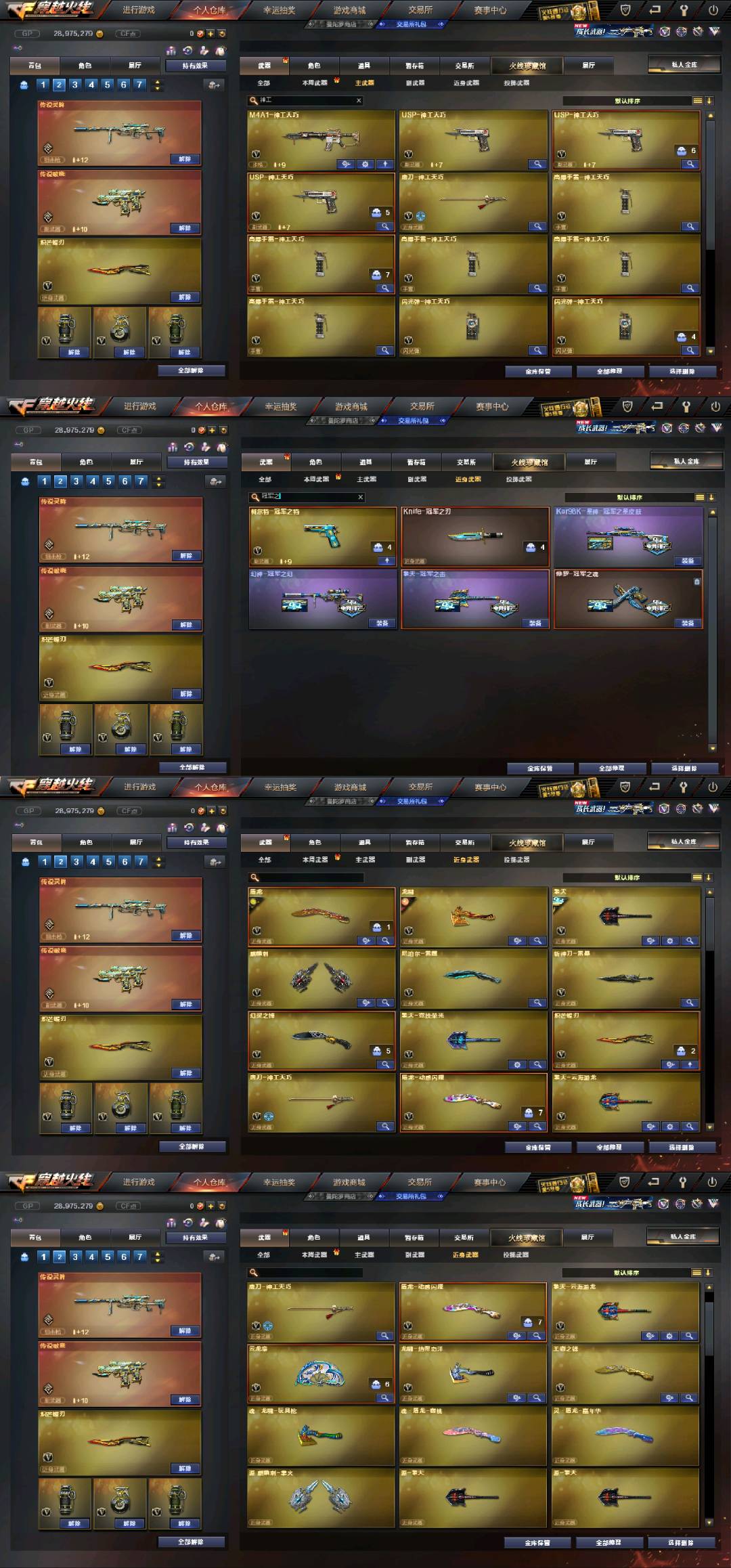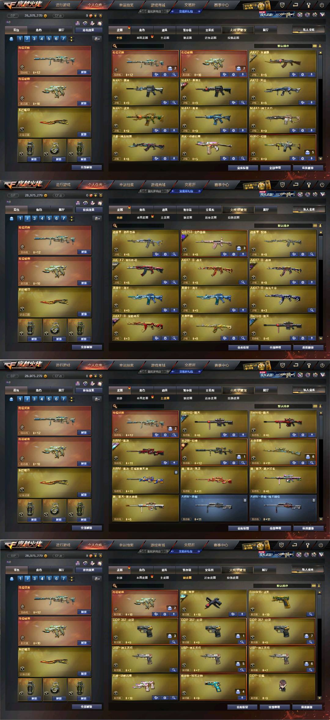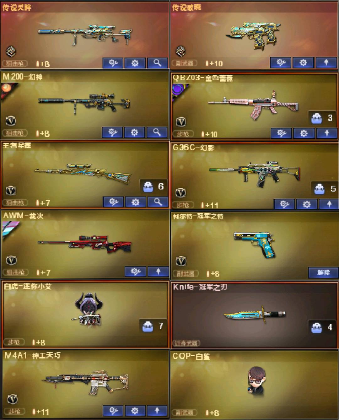 四个四防角色:晴雅+影豹+王者涂鸦+兰·巾帼英雄☆双传说(传说灵眸+传说破晓)+幻神双皮(冠军之幻+纸灯龙)qbz带皮(巅峰荣耀)+G36C-幻影☆神工天巧套☆冠军套☆白虎·迷你小艾☆冠军之特+冠军之刃+炽芒蝶刃☆王者芳薇☆cop幻灵×3+usp神工天巧×3+cop白鲨、斯泰尔蝴蝶等等,每把武器都带有皮肤!还有很多皮肤就不一一描述了,具体可以看图!;柯尔特-冠军之特,炽芒蝶刃,Knife-冠军之刃,晴雅,QBZ03-金色蔷薇,G36C-幻影,M200-幻神,