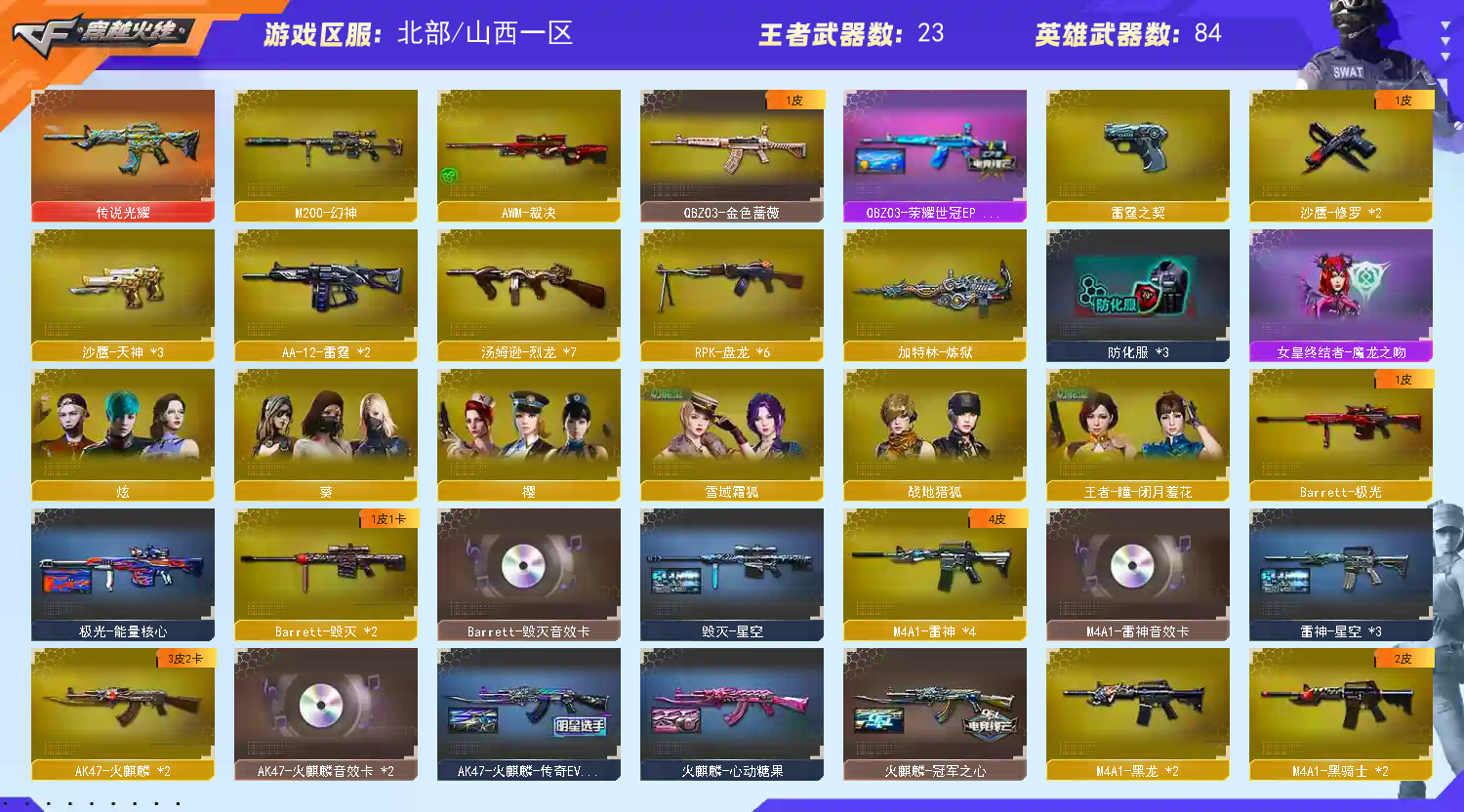 【m200幻神】【王者幻神】【传说光耀】【金色蔷薇】【6盘龙+7烈龙+1炼狱+死亡之眼】【雷霆套装】【火麒麟+火麒麟音效卡+冠军之心皮肤+传奇even皮肤】【雷神+雷神音效卡】【毁灭+毁灭音效卡】【王者冰魄 王者之心 王者之幻 王者之戮 王者之魄 王者之势 王者之武 王者之力 王者之怒 王者之霆】【烈火 天启 黑鲨 无影 机械迷城 黑龙 龙血 玫瑰精灵 超新星 黑武士 极光 裁决 aa12雷霆】——【热门武器/小人呛】【雷神精英刀锋 cat cop旗袍 】——【cop雷霆 天神*3 修罗 王者之魂】——【龙啸 尼泊尔雷霆 屠龙 王者之刺 王者之锋 王者之击 】——【雷霆投掷武器套装*7】——【角色】【葵 炫 樱】;RPK-盘龙,QBZ03-金色蔷薇,M200-幻神,