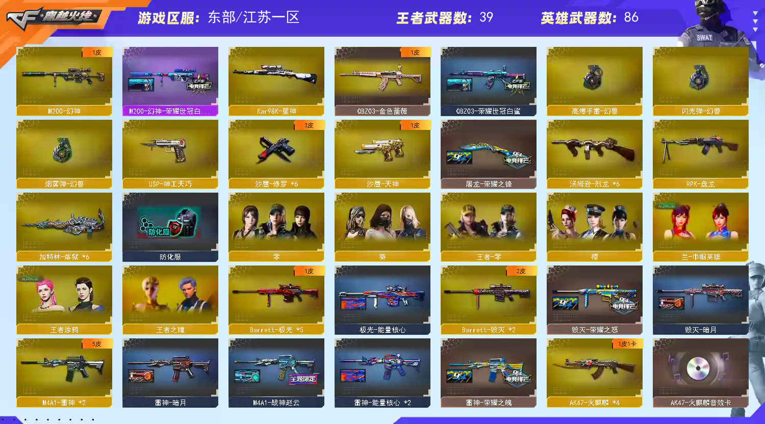 【m200幻神+荣耀世冠白鲨皮肤+usp神工天巧+幻兽投掷武器套装】【98k星神】【qbz03金色蔷薇+荣耀世冠白鲨皮肤+芭蕾特金色蔷薇】【6炼狱+6烈龙+死亡之眼】【火麒麟+火麒麟音效卡】【雷神+荣耀之魄皮肤】【毁灭+荣耀之魄皮肤】【王者之心 王者之影 王者之幻 王者之戮 王者之魄 王者之圣 王者之势 王者之武 王者之光 王者之力 王者之怒】【天启 麒麟 机械迷城 无影 黑龙 黑骑士 玫瑰精灵 千变 死神 武圣 无影神兵利器 黑武士 超新星 黑武士锦绣游龙 天龙 极光 盘龙】——【热门武器/小人呛】【m4a1刀锋 awem灵狐15周年嘉年华 cop旗袍】——【usp神工天巧 沙鹰幻兽 天神 修罗*6 天神动感闪耀 武圣手呛】——【龙啸 女皇利刃幻兽 麒麟刺 擎天 屠龙 王者之锋 唐刀神工天巧 屠龙动感闪耀 王者之刺 王者之锋 王者之击】——【幻兽投掷武器套装+神工天巧投掷武器套装】——【角色】【4防(兰巾帼英雄 王者涂鸦)】【葵 零 樱 乔伊教练 王者零 王者之瞳】;RPK-盘龙,QBZ03-金色蔷薇,M200-幻神,Kar98K-星神,