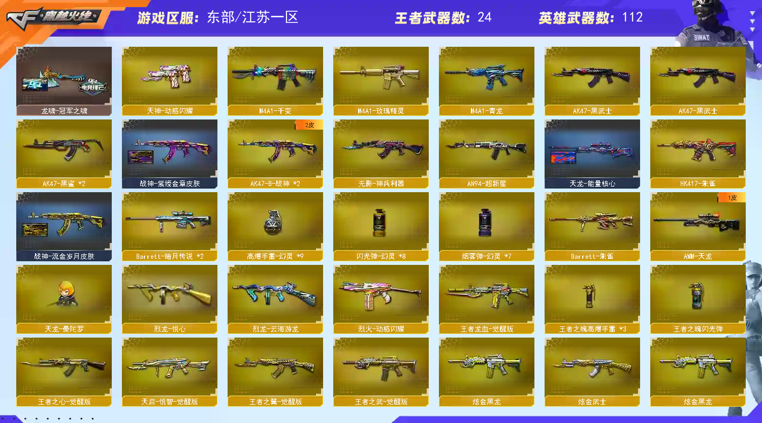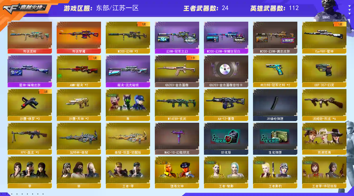 【传说灵眸】【m200幻神*3+冠军之幻皮肤+荣耀世冠白鲨皮肤+黄忠皮肤+柯尔特冠军之特*2+冠军之刃】【王者风神】【98k星神+璀璨皮肤】【传说梦魇】【王者白虎】【qbz03金色蔷薇+金色蔷薇音效卡+qbz03王者蔷薇+王者芳薇】【朱雀+朱雀音效卡+芭蕾特朱雀】【玄武】【青龙】【雷神+冠军之魄皮肤+巅峰荣耀皮肤+lgds18冠军皮肤】【毁灭+毁灭音效卡+冠军之怒皮肤+呛娘格雷姐妹皮肤】【火麒麟+冠军之心皮肤】【黑骑士+黑骑士音效卡+ags4典藏皮肤】【黑龙冠军之武皮肤】【极光+极光音效卡】【7烈龙+5盘龙+2炼狱+斯泰尔死亡之眼*2】【王者龙血 王者之心 王者之翼 王者之武 王者之怒 天启悦智 炫金黑龙 炫金骑士 炫金武士 炫金毁灭 烈龙月=悦心】【千变 黑武士 超新星 黑鲨 无影神兵利器 烈火动感闪耀 玫瑰精灵 战神 黑骑士海王 白虎电玩蓝兔 天龙 裁决 暗月传说 雷霆】【小人呛】白虎迷你小艾 雷神呛娘雷安娜 毁灭孙三炮 天龙曼陀龙 芭蕾特零水下丽影 金钢伞电玩红兔 牛牛ak awm灵狐15周年嘉年华 cop旗袍【柯尔特冠军之特 沙鹰修罗 沙鹰天神 cop357幻灵 天神动感闪耀】【屠龙 龙啸 擎天 麒麟刺 幻灵之锋 擎天竞技荣光 屠龙动感闪耀 擎天云海游龙 王者云击 龙啸烈火龙威】【幻灵投掷套装*7】【角色】【荒漠琉璃】【隼】【葵】【零】【4防王者魅影】【4防王者零华冠丽服】【4防王者影豹】【堕落女神 乔伊教练 王者零 王者之瞳 云海玲珑 暗夜x 北极狐x 炽天使 初恋灵狐 芳心审判者 风暴女 虎妞 空 龙儿 木兰 麻雀 青霞仙子 社长刀锋 蜀雪 妲己】;柯尔特-冠军之特,Knife-冠军之刃,隼,RPK-盘龙,QBZ03-金色蔷薇,M200-幻神,传说灵眸,