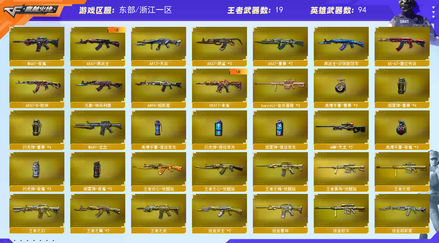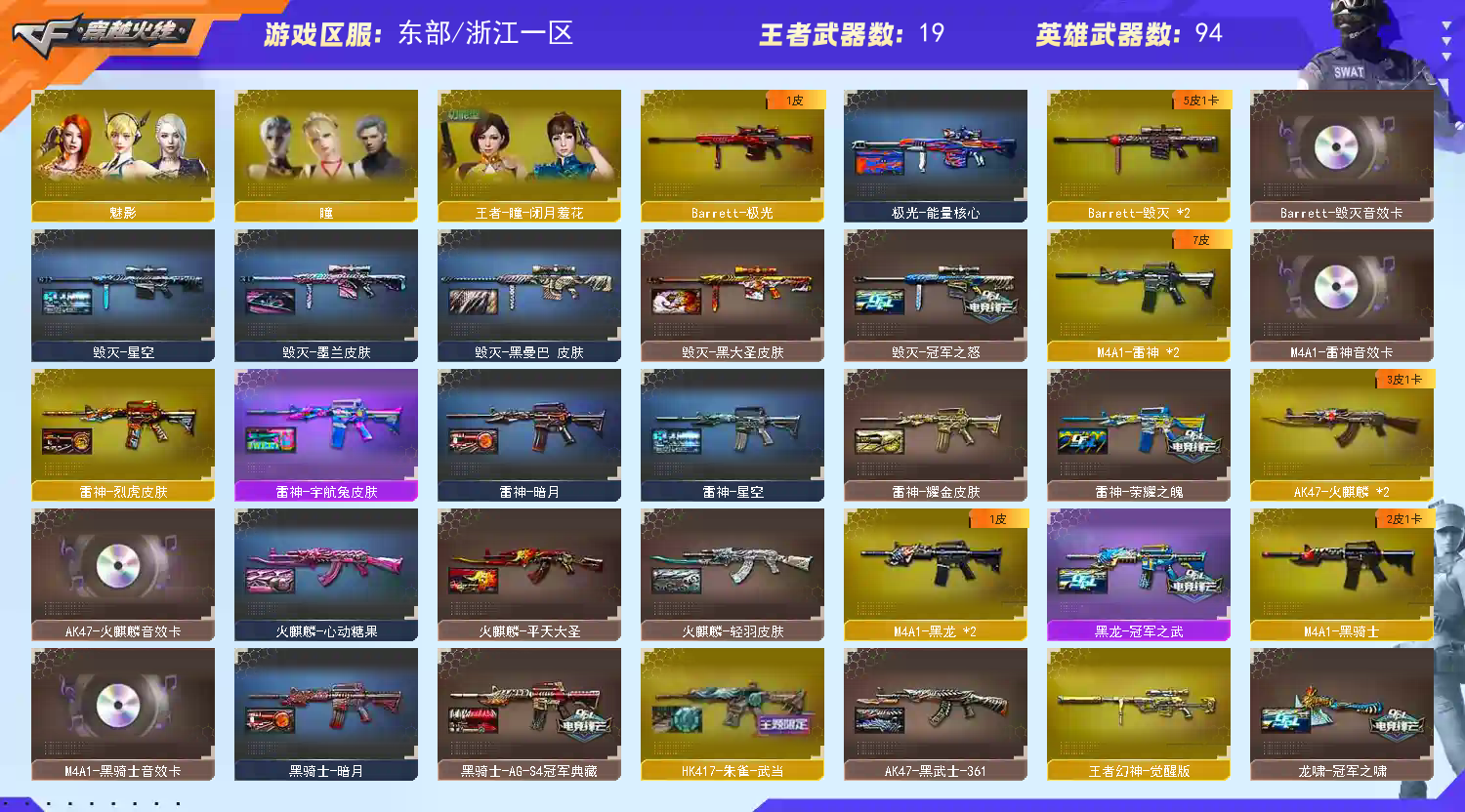 【m200幻神+冠军之幻皮肤+荣耀世冠白鲨皮肤+电流骇客皮肤+usp雷暴+冠军之刃】【王者幻神】【98k星神+星神音效卡】【传说光耀】【白虎+白虎音效卡】【qbz03金色蔷薇+巅峰荣耀皮肤+芭蕾特金色蔷薇】【5烈龙+3炼狱+1盘龙+斯泰尔蝴蝶】【雷暴套装】【夜魔套装】【网剧冠军套装】【hk417朱雀+武当皮肤】【毁灭+毁灭音效卡+冠军之怒皮肤】【雷神+雷神音效卡+荣耀之魄皮肤】【火麒麟+火麒麟音效卡】【黑骑士+黑骑士音效卡+s4冠军典藏皮肤】【黑龙+冠军之武皮肤】【王者炎心 王者凰鸣 王者之心 王者之翼 王者之鲨 王者之幻 王者之魄 王者之势 王者之武 王者之怒 】【烈火 天启 战神 黑鲨 龙血 无影神兵利器 超新星 黑武士 天龙 极光 aa12雷霆】——【热门武器/小人呛】【毁灭孙三炮 斯泰尔蝴蝶 牛牛ak 芭蕾特曼陀罗 cop旗袍 】——【usp雷暴 cop堕天神 破空呛刃夜魔 天神 修罗 天神网剧冠军 王者之灵 】——【龙啸 马来剑夜魔 麒麟刺 擎天 擎天网剧冠军 屠龙 王者之锋 王者之击 斩神到雷暴 唐刀神工天巧】——【竞技荣光投掷武器套装+雷暴投掷武器套装*3+夜魔投掷武器套装*3】——【角色】【4防王者春】【春 迷迭香 魅影 葵 零 瞳 炫 樱 王者瞳闭月羞花】;USP-雷暴,Knife-冠军之刃,RPK-盘龙,QBZ03-金色蔷薇,M200-幻神,Scar Light-白虎,Kar98K-星神,