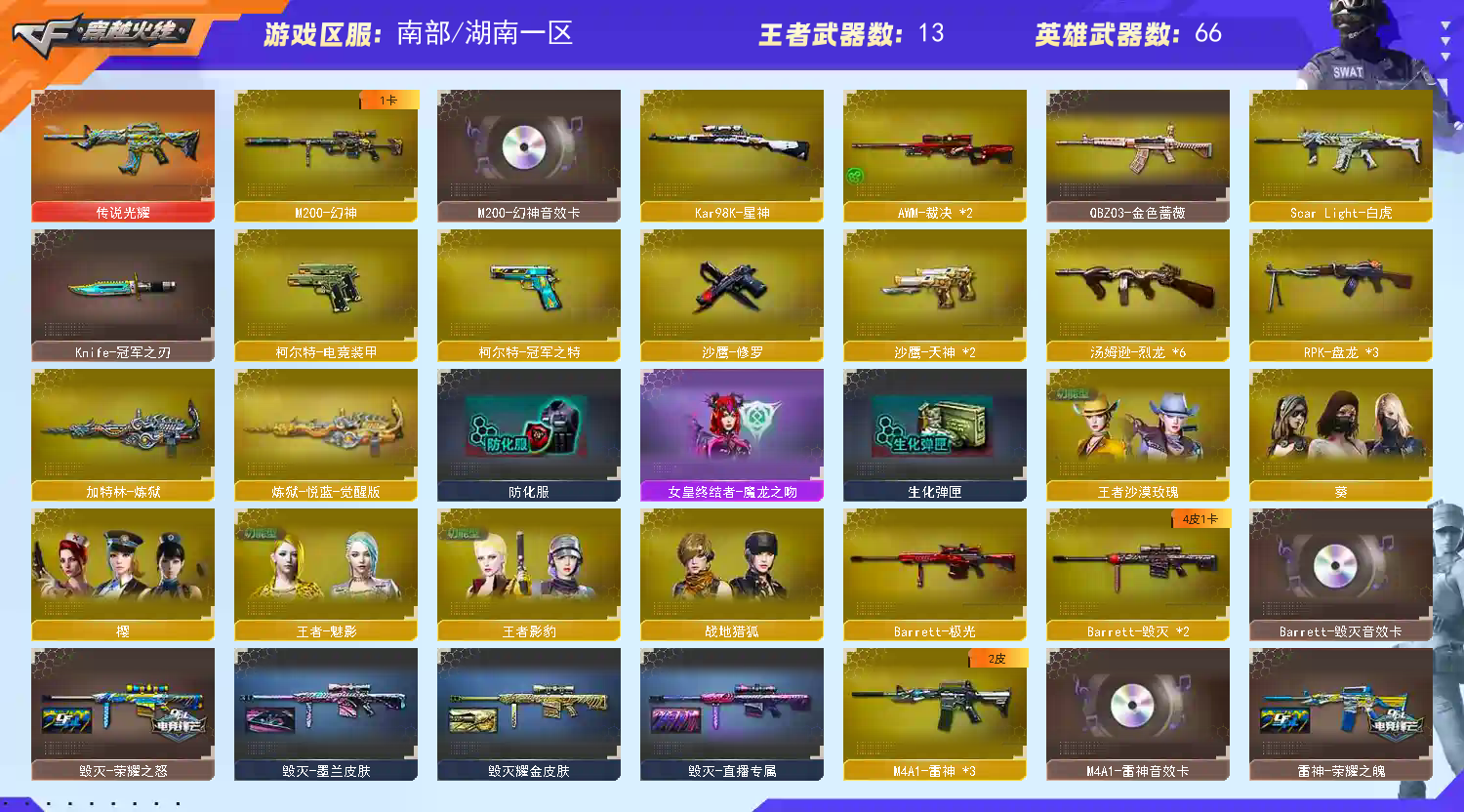 【m200幻神+幻神音效卡+柯尔特冠军之特+m200竞技荣光】【98k星神】【传说光耀】【白虎】【qbz03金色蔷薇+qbz03天罚】【6烈龙+3盘龙+2炼狱+死亡之眼】【电竞装甲】【毁灭+毁灭音效卡+荣耀之怒皮肤+直播专属】【雷神+雷神音效卡+荣耀之魄皮肤】【黑骑士+黑骑士音效卡+冠军之势】【火麒麟+冠军之心皮肤】【王者霜心 王者之心 王者之霆 王者之魄 王者之势 王者之决】【天启 战神 黑龙 龙血 武圣 黑骑士海王 裁决 无影神兵利器 天龙 极光 猩红传说 】——【热门武器/小人呛】【火麒麟灵狐 裁决雪莉杨 】——【柯尔特冠军之特 柯尔特电竞装甲 天神 修罗】——【屠龙 尼泊尔电竞装甲 麒麟刺 擎天竞技荣光 王者之击 王者之啸 王者之锋】——【电竞装甲投掷武器套装+幻灵投掷武器套装】——【角色】【4防(王者魅影 王者沙漠玫瑰 王者影豹 灵动武士)】【葵 樱】;柯尔特-冠军之特,Knife-冠军之刃,王者沙漠玫瑰,RPK-盘龙,QBZ03-金色蔷薇,M200-幻神,Scar Light-白虎,