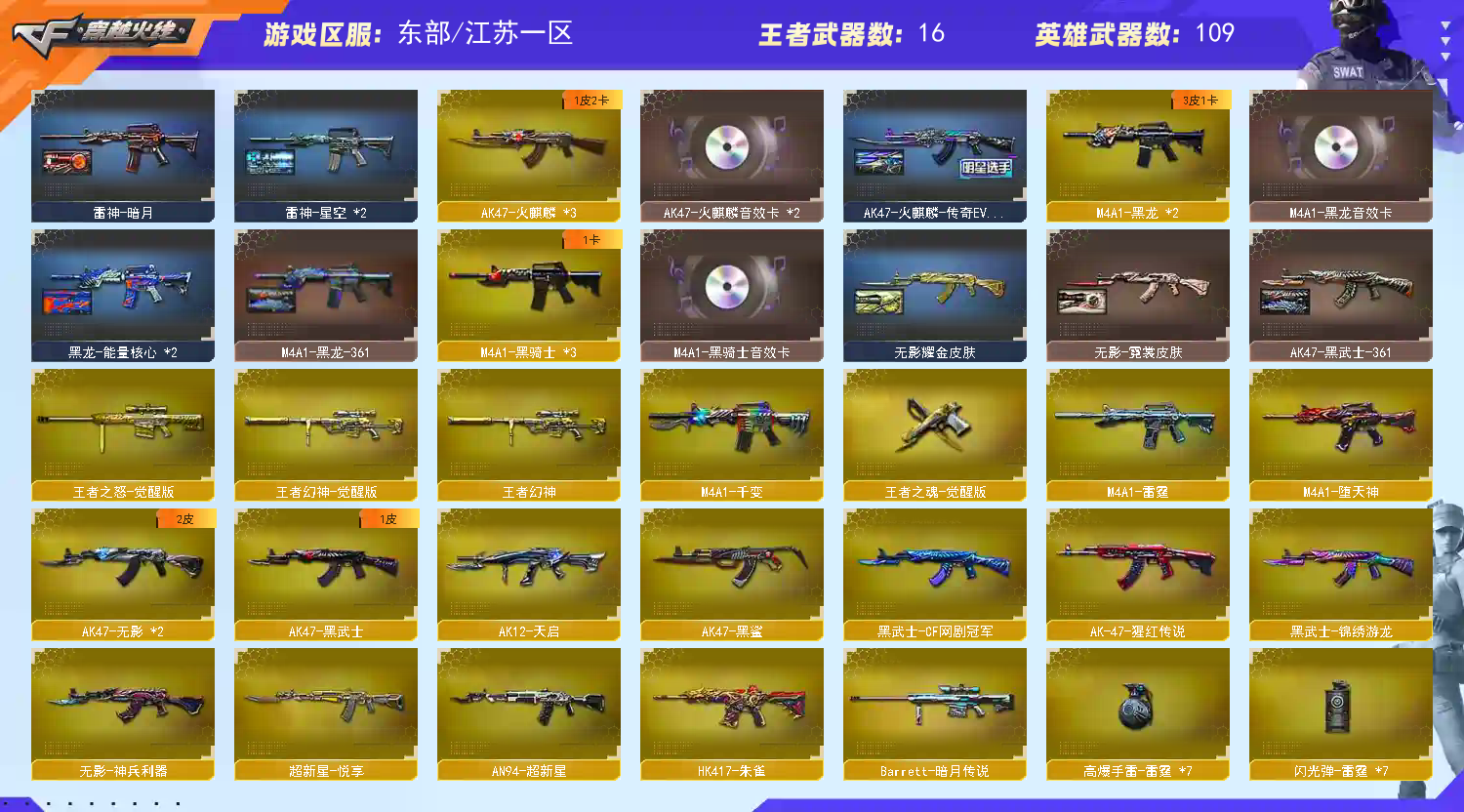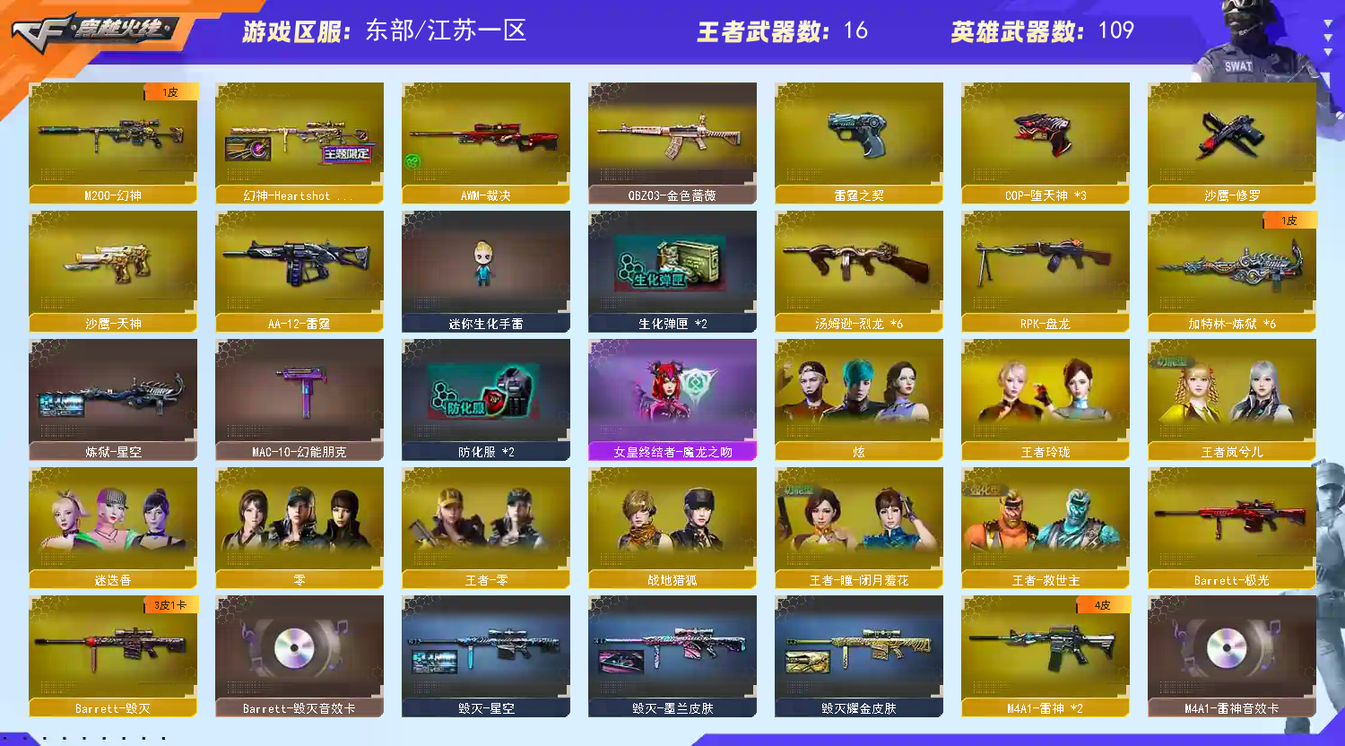【m200幻神+女团皮肤】【王者幻神*2】【qbz03金色蔷薇+金色蔷薇古蛇迷踪】【6炼狱+1盘龙+6烈龙+死亡之眼】【堕天神套装】【雷霆套装】【网剧冠军套装】【hk417朱雀】【火麒麟+火麒麟音效卡+传奇even皮肤】【雷神+雷神音效卡+白鲨s14冠军皮肤】【毁灭+毁灭音效卡】【黑龙+黑龙音效卡】【黑骑士+黑骑士音效卡】【王者之城 王者之心 王者之翼 王者之幻 王者之戮 王者之魄 王者之魄 王者之力 王者之怒】【烈火 天启 黑鲨 无影 千变 无影神兵利器 黑武士 超新星 黑武士锦绣游龙 暗月传说 极光 裁决 aa12雷霆】——【热门武器/小人呛】【hk417朱雀蛇隐宗 雷神精英刀锋 火麒麟绝迹 芭蕾特零水下丽影 m37葵 】——【cop堕天神*3 cop雷霆 天神 修罗 天神网剧冠军 王者之魂 修罗古蛇迷踪 】——【龙啸 龙啸堕天神 龙啸烈火龙威 马来剑夜魔 尼泊尔雷霆 麒麟刺堕天神 擎天网剧冠军 屠龙 王者之啸】——【堕天神投掷武器套装*6+雷霆投掷武器套装*7+夜魔投掷武器套装】——【角色】【4防王者岚兮儿】【迷迭香 零 炫】;RPK-盘龙,QBZ03-金色蔷薇,M200-幻神,