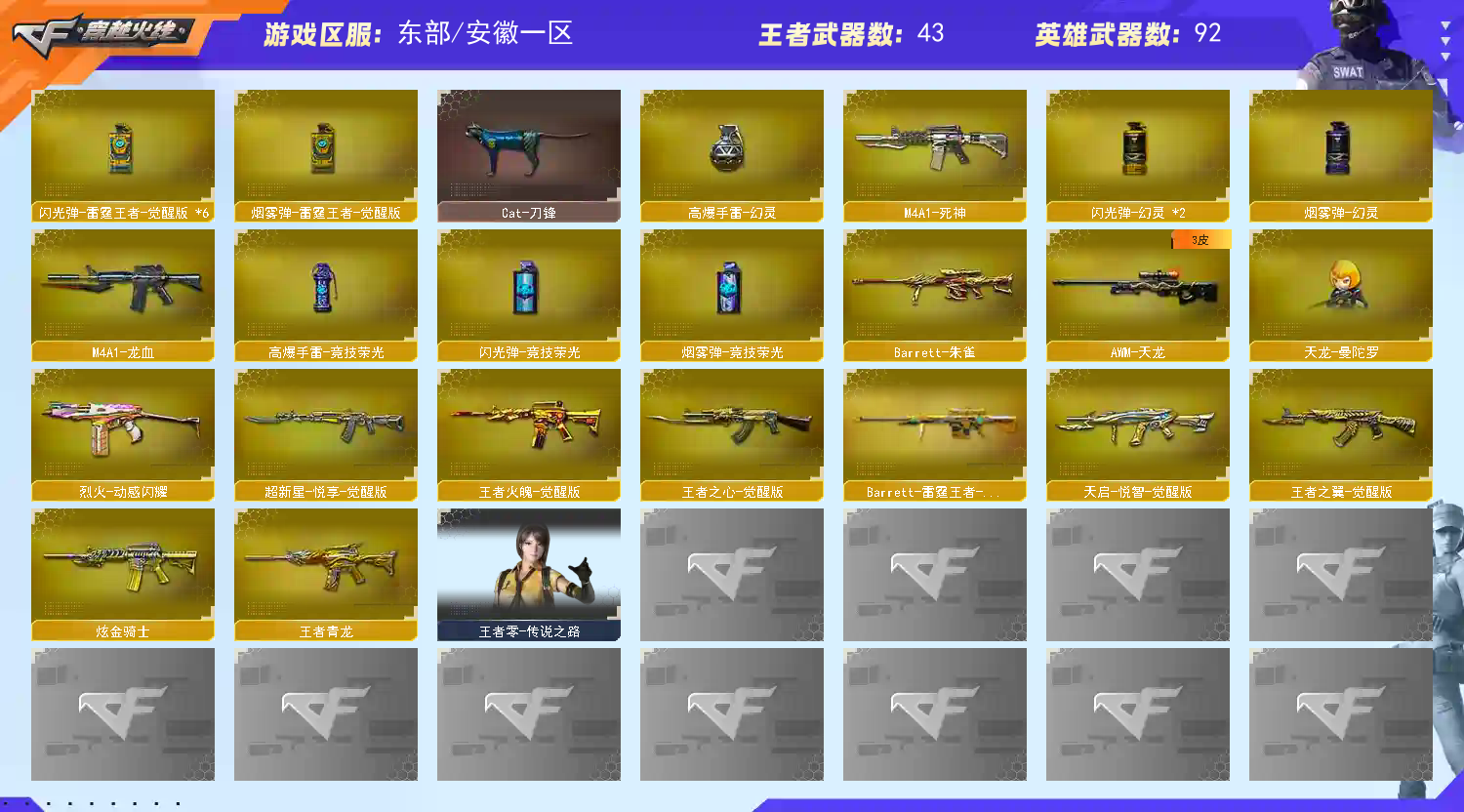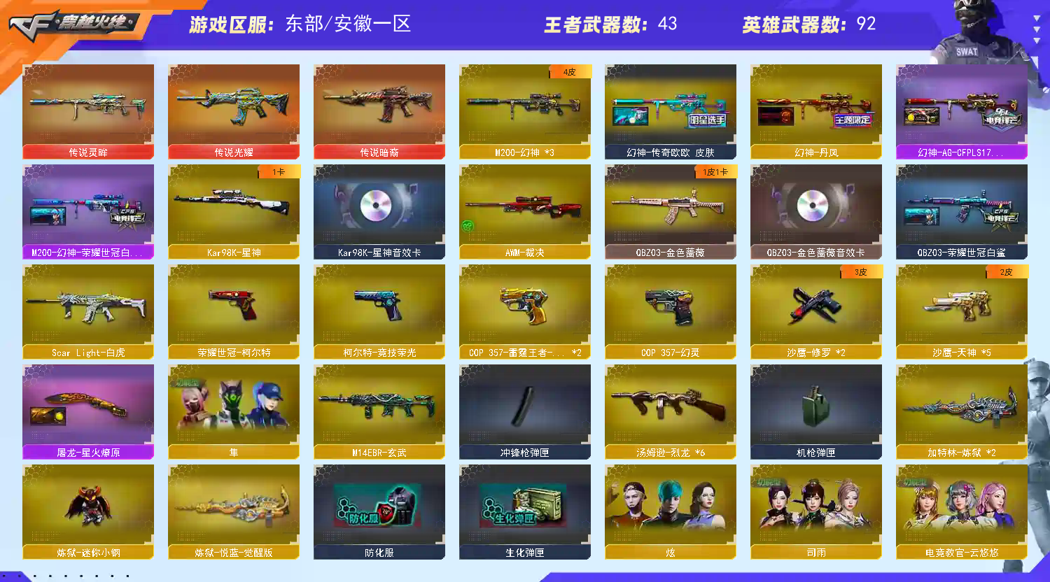 【传说灵眸 传说光耀 传说暗裔】【m200幻神*4+ag冠军皮肤+传奇欧欧皮肤+荣耀世冠白鲨皮肤+丹凤皮肤】【m200竞技荣光套装+电竞教官云悠悠】【王者风神】【98k星神+星神音效卡】【白虎】【qbz03金色蔷薇+金色蔷薇音效卡+荣耀世冠白鲨皮肤+王者芳薇】【6烈龙+3炼狱+炼狱迷你小钢】【荣耀世冠套装】【雷霆王者套装】【幻灵套装】【网剧冠军套装】【hk417朱雀 青龙 玄武 白虎】【毁灭+毁灭音效卡+直播专属皮肤+sv冠军皮肤】【雷神+雷神音效卡+荣耀之魄皮肤+荣耀世冠ag皮肤】【火麒麟+横秒之巅皮肤】【黑骑士+黑骑士音效卡】【黑龙+黑龙音效卡】【王者森决 王者青龙 王者火魄 王者之心 王者之翼 王者之怒】【烈火 天启 常胜将军 身先士卒 黑鲨 机械迷城 无影 龙血 千变 死神 武圣 玫瑰精灵悦动 天启悦智 无影神兵利器 超新星悦享 天龙 极光 裁决 】——【热门武器/小人呛】【天龙曼陀罗 炼狱迷你小钢 黄金猫猫手套白鲨 金刚伞 牛牛ak 金色小号 m37葵 cop旗袍 】——【cop幻灵 cop雷霆王者*2 柯尔特竞技荣光 荣耀世冠柯尔特 天神*5 修罗*2 天神网剧冠军 王者之魂 天神动感闪耀 武圣手呛】——【幻灵之锋 雷霆王者之锋 龙啸 龙啸烈火龙威 麒麟刺 擎天 擎天网剧冠军 擎天竞技荣光 荣耀世冠龙啸 屠龙 王者玉锋 王者之啸】——【幻灵投掷武器套装+竞技投掷武器荣光套装+雷霆王者投掷武器套装*6】——【角色】【4防(电竞教官云悠悠 隼 王者春 王者葵貂蝉 王者潘多拉 王者涂鸦 暗夜审判 零热舞青春 樱青春偶像】【机械姬 司雨 瞳 炫 乔伊教练 新海豹突击队】;荣耀世冠-柯尔特,隼,电竞教官-云悠悠,QBZ03-金色蔷薇,M200-幻神,Scar Light-白虎,传说灵眸,