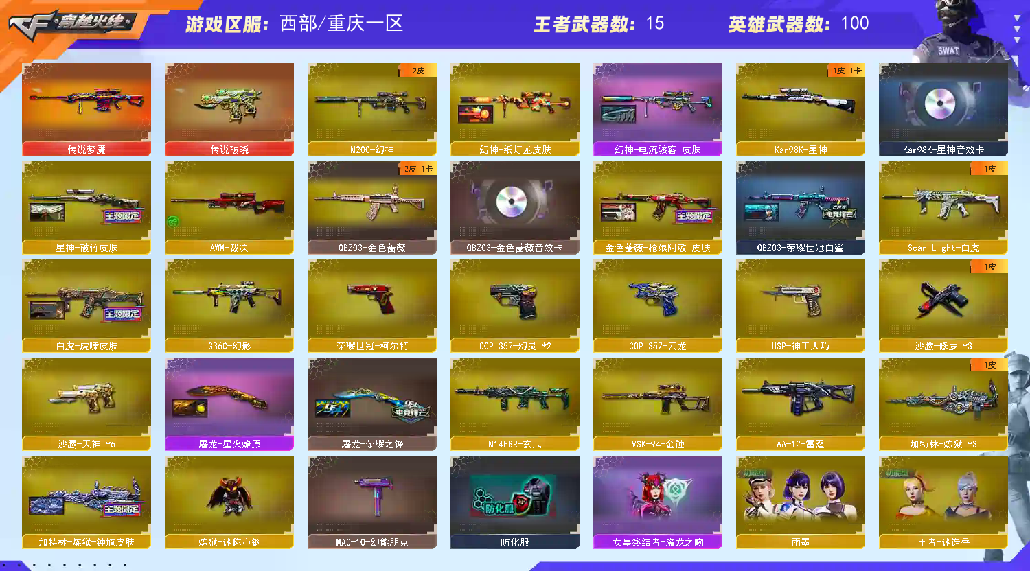 首页 > 租号大厅 > 穿越火线 > 电信区/重庆一区 > 西部⭐幻神+纸灯笼皮肤+电流骇客皮肤+传说破晓+usp神工天巧+炽芒蝶刃+星神三件套+白虎三件套