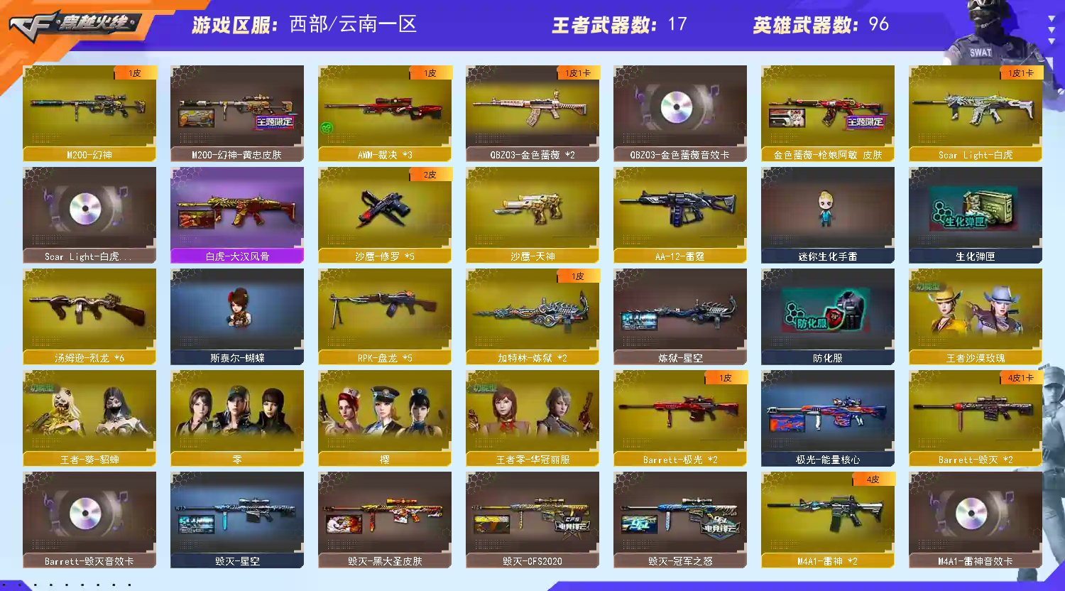 【白虎三件套!!!】【qbz03金色蔷薇三件套!!!】【m200幻神+黄忠皮肤】【白虎+白虎音效卡+大汉风骨皮肤】【6黑骑士+黑骑士音效卡+冠军之势皮肤】【6烈龙+5盘龙+2炼狱+斯泰尔蝴蝶+斯泰尔死亡之眼】【qbz03金色蔷薇+qbz03金色蔷薇音效卡+呛娘阿敏皮肤】【毁灭+毁灭音效卡+冠军之怒皮肤】【雷神+雷神音效卡+白鲨s14冠军皮肤】【火麒麟+火麒麟音效卡+ag冠军皮肤】【朱雀】【王者之心 王者之戮 王者之光 王者之怒】【烈火 战神 黑鲨 无影 黑龙 龙血 玫瑰精灵 千变 死神 雷神葫芦兄弟 黑武士 黑武士锦绣游龙 天龙 极光 芭蕾特金色蔷薇 芭蕾特朱雀 裁决 aa-12-雷霆】——【热门武器/小人呛】【毁灭孙三炮 斯泰尔蝴蝶 金色小号 灵狐15周年嘉年华】——【天神 修罗*5 天神动感闪耀】——【龙啸*3 龙啸堕天神 龙啸热带奇洋 尼泊尔雷霆 麒麟刺 麒麟刺堕天神 擎天*3 屠龙 王者之锋】——【电竞装甲投掷物套装 堕天神投掷物套装*3 雷霆投掷物套装 雷霆王者投掷物套装*3 神工天巧投掷物套装】——【角色】【4防王者葵貂蝉 王者沙漠玫瑰】【零 樱】【王者零华冠丽服 奇洋探员 乔伊教练】;王者沙漠玫瑰,RPK-盘龙,QBZ03-金色蔷薇,M200-幻神,Scar Light-白虎,
