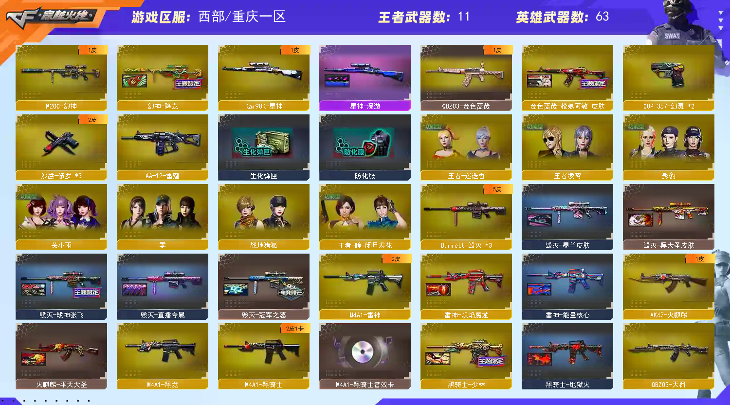 【【m200幻神+降龙皮肤】【98k星神+漫游皮肤】【白虎之魄】【qbz03金色蔷薇+呛娘阿敏皮肤+qbz03天罚】【毁灭+冠军之怒皮肤+直播专属皮肤】【王者之烈 王者之魄 王者之武 王者之心 王者之怒 王者之霆 炫金千变】【黑骑士+黑骑士音效卡】【天启 火麒麟 机械迷城 无影 黑龙 黑骑士 雷神 千变 青龙 朱雀 黑武士 毁灭 aa12雷霆】——【cop幻灵*2 沙鹰修罗*3】——【幻灵之锋 龙啸*2 龙啸烈火龙威 麒麟刺 擎天*2+冠军之击皮肤 擎天竞技荣光 王者之锋】——【幻灵投掷武器套装*7 竞技荣光投掷武器套装*2】——【热门武器/小人呛】【雷神小红 裁决雪莉杨 黄金猫猫手套白鲨 金刚伞】——【角色】【4防影豹】【4防王者迷迭香】【4防暗夜审判】【4防女主播】【4防灵狐者职业经理】【关小雨】【零 王者瞳闭月羞花 王者凌霄】【蛇隐宗 新海豹突击队】;QBZ03-金色蔷薇,M200-幻神,Kar98K-星神,