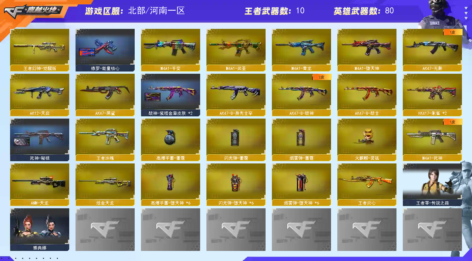 河南一区100v【m200幻神+星耀】【王者幻神】【6烈龙 6炼狱 死亡之眼】【传说光耀】【qbz金色蔷薇+卡】【hk417朱雀】【火麒麟+卡+cfs2018】【黑龙】【雷神+卡】【黑骑士+卡+冠军之势】【毁灭+卡】【极光】【裁决】 【武器:武圣 堕天神 青龙 王者之武 天龙 】 【6手呛:修罗*2 天神 武圣 cop堕天神 】 【9刀具:屠龙*2 龙啸 擎天 麒麟刺 尼泊尔雷霆 王者之啸*2】 【7雷套:雷霆雷 堕天神雷*6】 【小人呛:雷神精英刀锋 火麒麟灵狐 马呛】 【音效卡:火麒麟音效卡*2 黑骑士音效卡 毁灭音效卡 雷神音效卡 金色蔷薇音效卡 】 【四防角色:王者葵貂蝉】;QBZ03-金色蔷薇,M200-幻神,