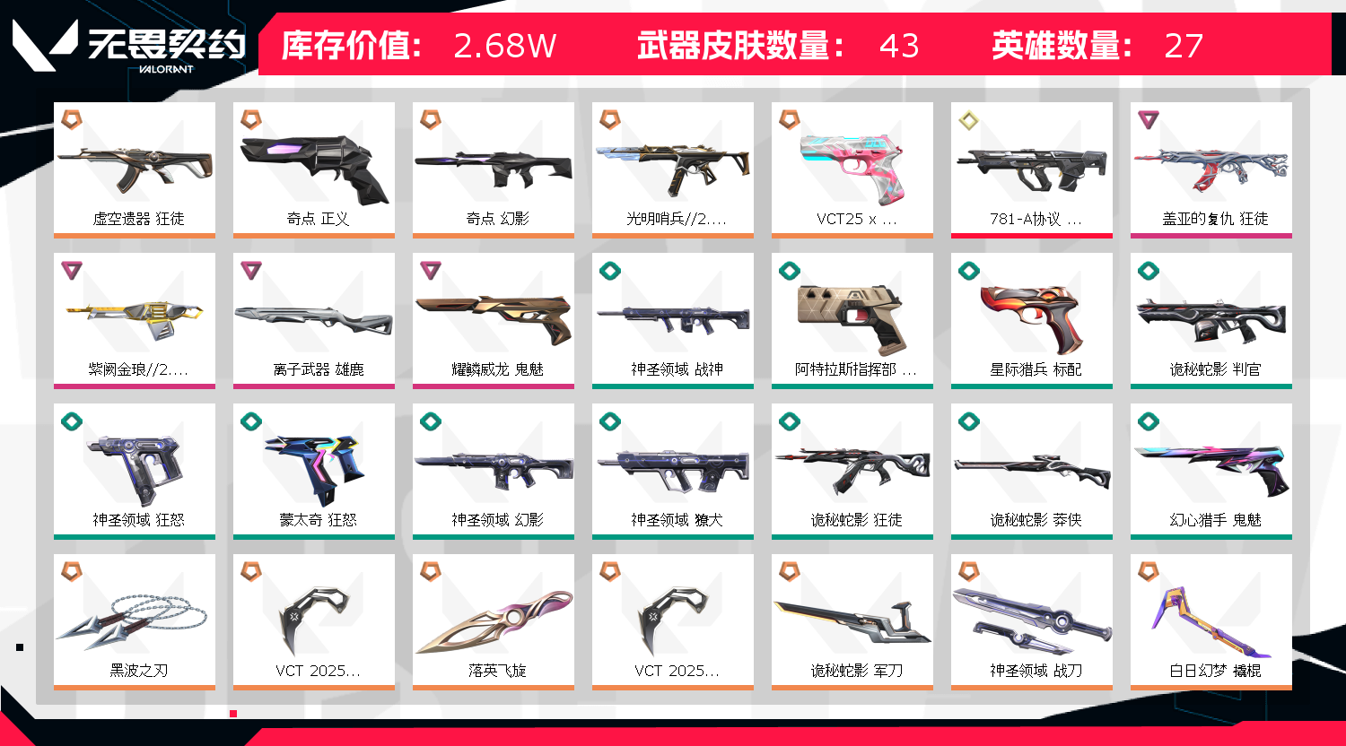 使用外挂,恶意发言,在游戏内骗人等违规操作,拉黑全网公示,使用外挂脚本导致非正常游戏封号的,在平台提取租客实名iP地址,本账号经过江苏省南京市公安局六合分局网络财产备案,一经发现直接报警处理立案追责,根据账号价值全额赔偿,感谢支持!!;黑波之刃,VCT 2025 爪刀,盖亚的复仇 狂徒,虚空遗器 狂徒,奇点 正义,