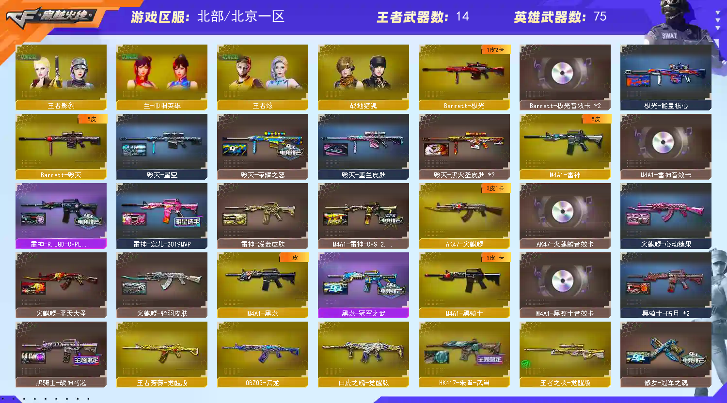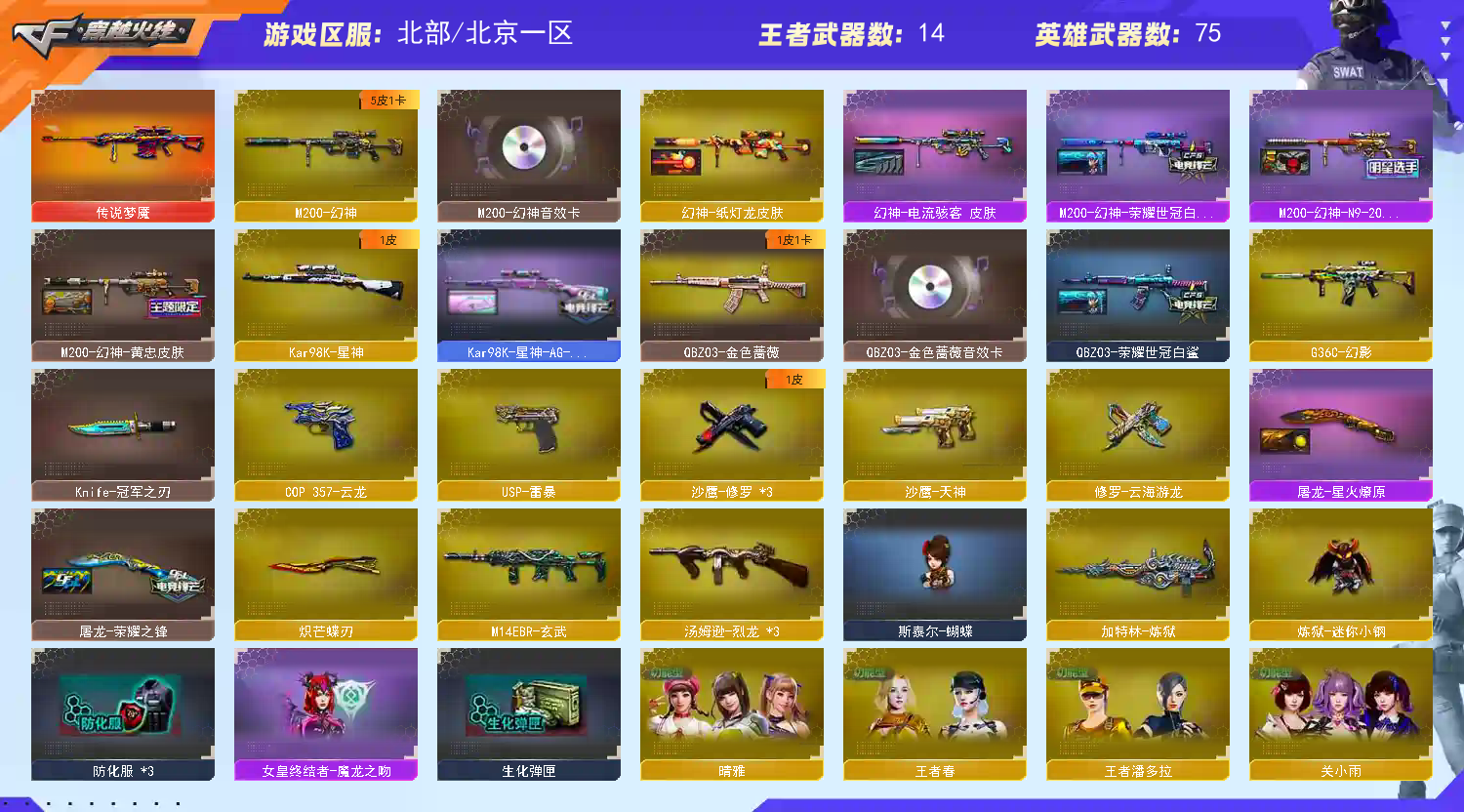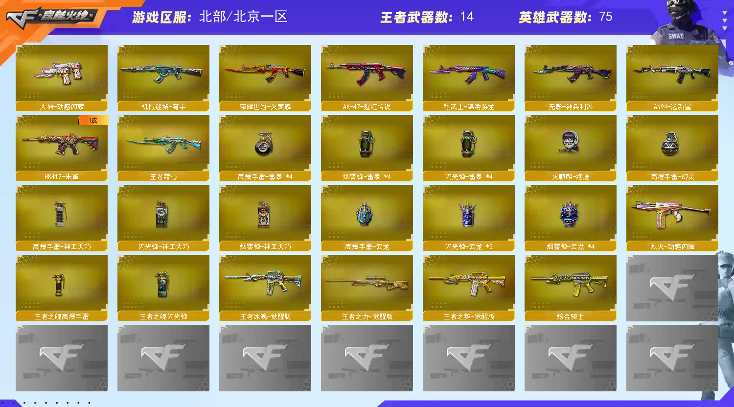 王者武器:王者云击;炫金骑士;王者之势-觉醒版;王者之魄高爆手雷;王者之魄闪光弹;王者霜心;王者冰魄-觉醒版;王者之决-觉醒版;王者之力-觉醒版 英雄武器:烟雾弹-云龙;斩神刀-雷暴;USP-雷暴;修罗-云海游龙;高爆手雷-雷暴;烟雾弹-雷暴;闪光弹-雷暴;M4A1-雷神;AN94-超新星;M14EBR-玄武;荣耀世冠-火麒麟;M4A1-黑骑士;加特林-炼狱;传说梦魇;M4A1-黑龙;M200-幻神;Kar98K-星神;手雷-云海游龙;AK47-火麒麟;Barrett-毁灭;炽芒蝶刃;云龙扇;闪光弹-云龙;高爆手雷-云龙;COP 357-云龙;QBZ03-云龙;汤姆逊-烈龙;手雷-热带奇洋;麒麟刺;AK-47-猩红传说;龙啸-热带奇洋;超新星-热带奇洋;黑武士-锦绣游龙;荣耀世冠-龙啸;Barrett-极光;沙鹰-天神;屠龙;QBZ03-金色蔷薇;擎天;G36C-幻影;幻灵之锋;无影-神兵利器;龙啸-烈火龙威;闪光弹-神工天巧;HK417-朱雀;屠龙-动感闪耀;天神-动感闪耀;沙鹰-修罗;高爆手雷-神工天巧;;USP-雷暴,炽芒蝶刃,Knife-冠军之刃,晴雅,QBZ03-金色蔷薇,G36C-幻影,M200-幻神,