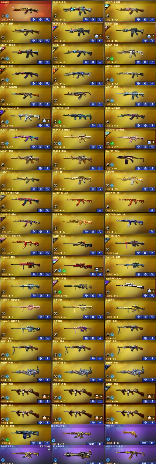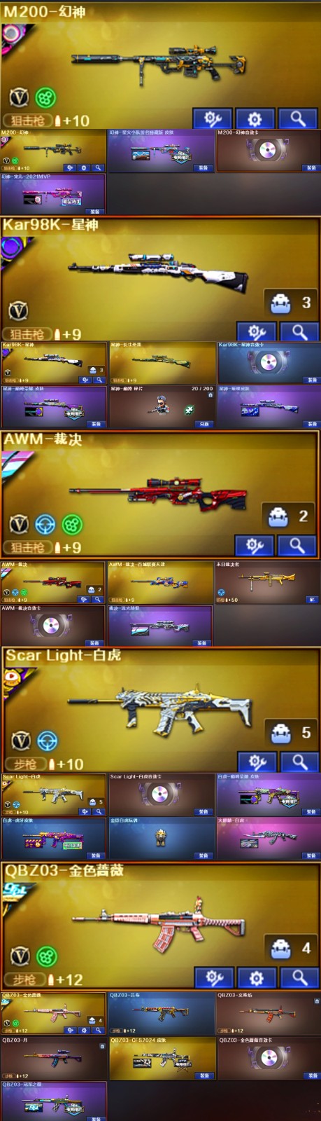 王者武器:王者之怒-觉醒版;王者炎心-觉醒版;王者之光-觉醒版;王者之啸-觉醒版;王者雷怒;王者之心-觉醒版;王者之击-觉醒版;王者之势-觉醒版;王者之魄-觉醒版;炫金毁灭;王者之锋-觉醒版;炫金黑龙 英雄武器:柯尔特-荣耀世冠白鲨2023;闪光弹-竞技荣光;炽芒蝶刃;擎天;荣耀世冠-柯尔特;屠龙;M4A1-猎神;闪光弹-云龙;黑武士-锦绣游龙;汤姆逊-烈龙;传说夜影;闪光弹-神工天巧;烟雾弹-神工天巧;高爆手雷-神工天巧;USP-神工天巧;无影-神兵利器;Barrett-暗月传说;AK47-机械迷城;AK47-火麒麟;AWM-裁决;柯尔特-冠军之特;烟雾弹-电竞装甲;恶棍-电竞装甲;闪光弹-电竞装甲;柯尔特-电竞装甲;麒麟刺;M14EBR-玄武;高爆手雷-幻灵;Scar Light-白虎;AK47-B-常胜将军;AK47-B-战士;AK47-B-身先士卒;龙啸;M200-幻神;Kar98K-星神;QBZ03-金色蔷薇;9A91-烈火;马来剑-夜魔;高爆手雷-夜魔;闪光弹-夜魔;烟雾弹-夜魔;M4A1-黑龙;AK47-B-战神;AK-47-猩红传说;雷霆之怒;高爆手雷-雷霆;烟雾弹-雷;荣耀世冠-柯尔特,柯尔特-荣耀世冠白鲨2023,柯尔特-冠军之特,炽芒蝶刃,Knife-冠军之刃,传说女帝,RPK-盘龙,