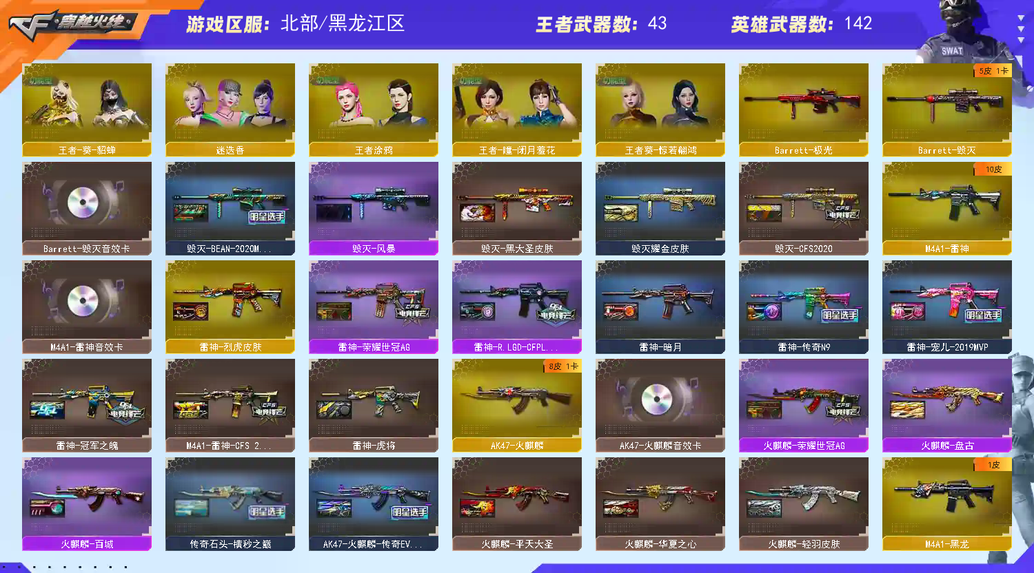 >>>>>>毁号,涉及毁坏虚拟财产罪及计算机安全罪,请文明游戏素质游戏,让我们共建美好租号平台>>>>>> 主武器、副武器、近身武器够用 拥有完美游戏体验。特殊装备有:加特林-炼狱、传说圣灵、传说光耀、荣耀世冠-龙啸、荣耀世冠-火麒麟、荣耀世冠-雷神、荣耀世冠-柯尔特、龙啸-堕天神、M200-幻神、HK417-朱雀、传说梦魇、M4A1-玫瑰精灵、AK47-火麒麟、麒麟刺、炫金骑士、高爆手雷-雷霆王者、闪光弹-雷霆王者、烟雾弹-雷霆王者、王者冰魄-觉醒版、王者玉锋、王者炎心-觉醒版、王者之锋-觉醒版、炫金黑龙、王者白虎-觉醒版、炫金雷神、王者火魄、王者雷怒、炫金毁灭、炫金火麒麟、王者之力-觉醒版、王者之心-觉醒版、王者之势-觉醒版、王者之魄-觉醒版、迷迭香、传说女帝、王者涂鸦、王者玲珑-小乔、灵狐者-职业经理、职业选手、堕天使、王者-葵-貂蝉、王者-瞳-闭月羞花、M4A1-黑骑士音效卡、生化弹匣、王者之魄金色光效、王者之啸金色光效、王者之心金色光效、等,随意畅选。 注意事项: A.游戏过程中请不要恶意挂机或者不文明;荣耀世冠-柯尔特,传说女帝,RPK-盘龙,QBZ03-金色蔷薇,M200-幻神,Scar Light-白虎,Kar98K-星神,