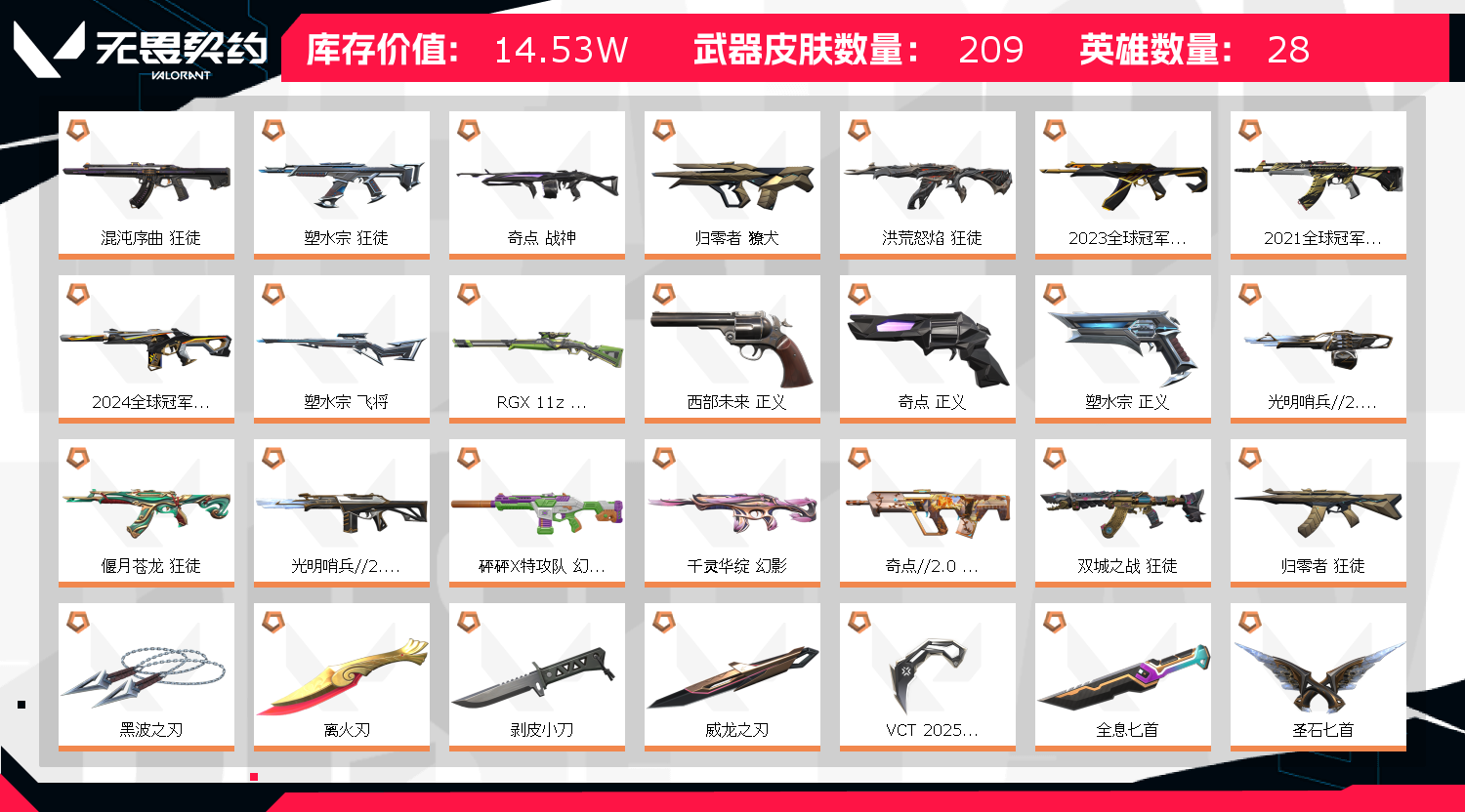 ❤️❤️❤️账号库存价值较大,已做大额虚拟资产备案,开挂盗号等行为报案处理,请不要以身试法。 ❤️❤️❤️禁止游戏内挂机违者拉黑公示,喜欢本账号请点收藏★方便下次租用,谢谢光临惠顾!;奇点 战神,黑波之刃,离火刃,剥皮小刀,威龙之刃,VCT 2025 爪刀,归零者 獠犬,