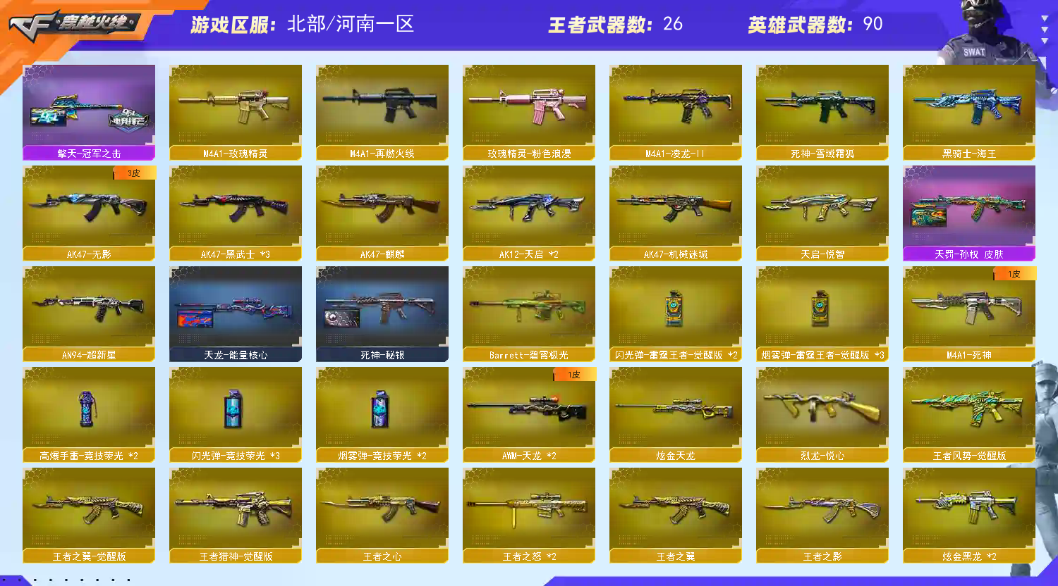 生化号,暂不可排位。传说幽瞳,传说星骇,炽芒蝶刃,六烈六盘,裁决,裁决音效卡,天罚,天罚音效卡,炼狱,枪娘暗刃,枪娘樱,竞技荣光全套,背包都有。注:幻神,星神,白虎木有(生化号,不是爆破号);炽芒蝶刃,传说星骇,RPK-盘龙,QBZ03-金色蔷薇,传说幽瞳,G36C-幻影,