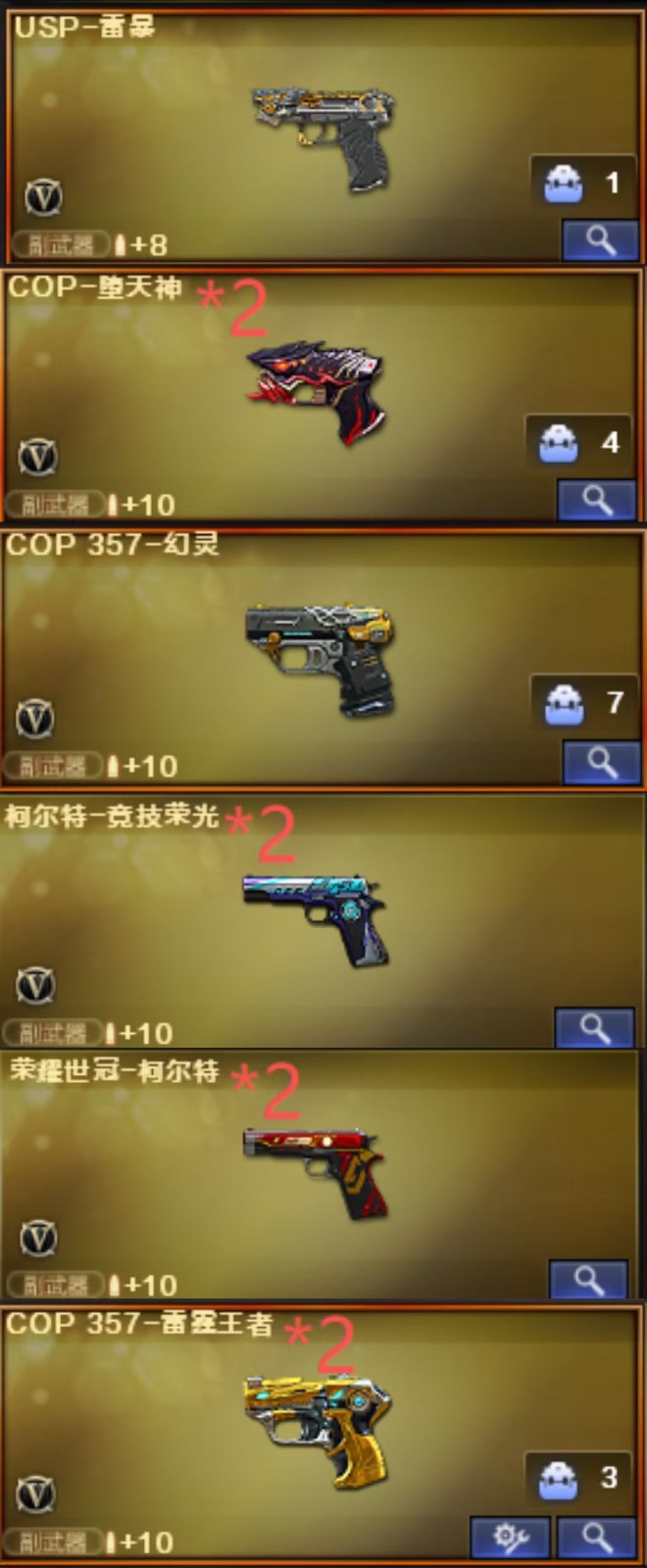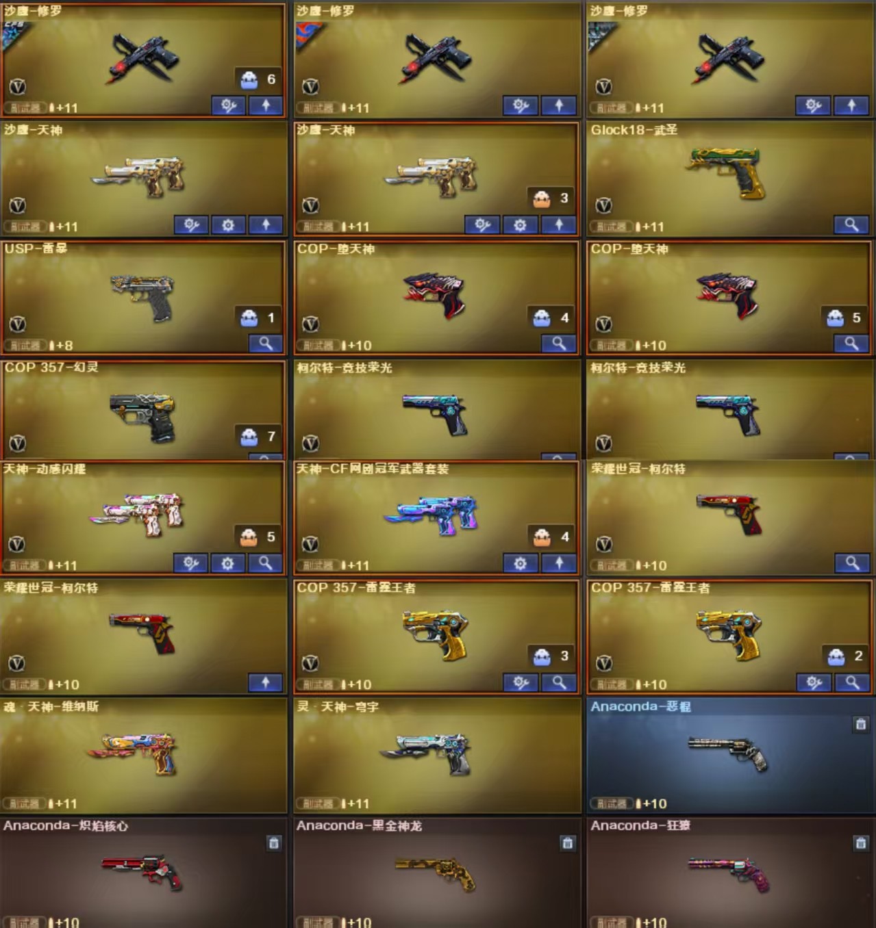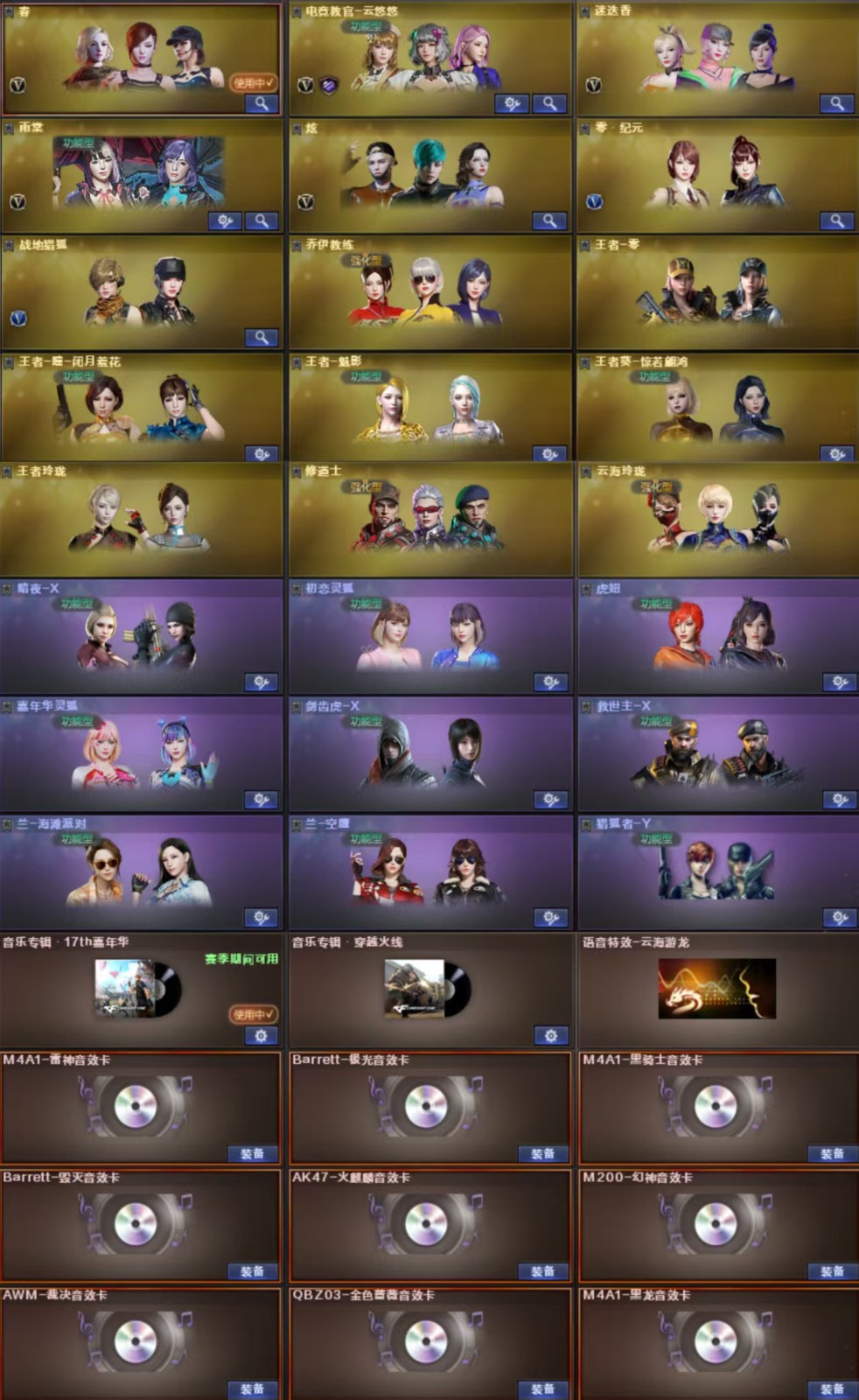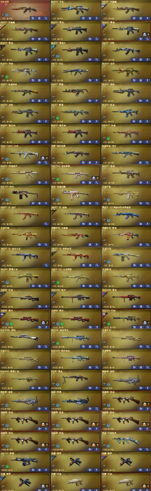 【王者武器】:【炫金武士-1,炫金雷神-1,炫金毁灭-2,烟雾弹-雷霆王者-1,王者雷怒-1,王者青龙-1,高爆手雷-雷霆王者-2,Barrett-雷霆王者-觉醒版-1,COP 357-雷霆王者-觉醒版-2,M4A1-雷霆王者-觉醒版-1,QBZ-03-王者蔷薇-觉醒版-1,烟雾弹-雷霆王者-觉醒版-1,王者之击-觉醒版-2,王者之力-觉醒版-2,王者之势-觉醒版-1,王者之烈-觉醒版-1,王者之锋-觉醒版-1,闪光弹-雷霆王者-觉醒版-2,雷霆王者之锋-觉醒版-1,炫金骑士-1,炫金千变-1】 【英雄武器】:【M4A1-死神-1,AK12-天启-1,M4A1-武圣-1,M4A1-千变-1,M4A1-黑骑士-1,M4A1-玫瑰精灵-1,屠龙-4,AK47-机械迷城-1,龙啸-3,AK47-无影-1,麒麟刺-2,AK47-火麒麟-2,AWM-天龙-1,Barrett-毁灭-1,汤姆逊-烈龙-6,Barrett-极光-1,RPK-盘龙-1,沙鹰-修罗-3,加特林-炼狱-2,沙鹰-天神-2,Glock18-武圣-1,M4A1-雷神-2,M4A1-黑龙-1,9A91-烈火-1,M200-幻神-1,USP-雷暴-1,烈龙-云海游龙-1,高爆手雷-雷暴-7,黑武士-CF网剧冠军-1,烟雾弹-雷霆-1,闪光弹-雷霆-1,闪光弹-雷暴-7,烟雾弹-雷暴-7,斩神刀-雷暴-1,M200-竞技荣光-1,传说夜影-1,天神-CF网剧冠军-1,幻灵之锋-1,擎天-CF网剧冠军-1,擎天-竞技荣光-1,柯尔特-竞技荣光-2,炼狱-风暴-1,烟雾弹-竞技荣光-4,闪光弹-竞技荣光-3,高爆手雷-竞技荣光-4,Scar Light-白虎-1,闪光弹-神工天巧-2,高爆手雷-雷霆-1,无影-神兵利器-1,烟雾弹-神工天巧-1,AA-12-雷霆-1,Barrett-暗月传说-1,QBZ03-金色蔷薇-1,HK417-朱雀-1,烈火-动感闪耀-1,手雷-动感闪耀-1,天神-动感闪耀-1,擎天-云海游龙-1,屠龙-动感闪耀-1,Kar98K-星神-1,擎天-1,M4A1-堕天神-2,COP-堕天神-2,AWM-裁决-2,高爆手雷-堕天神-7,龙啸-堕天神-3,麒麟刺-堕天神-2,闪光弹-堕天神-7,烟雾弹-堕天神-7,M4A1-青龙-1,AK47-雷暴-1,AK47-B-常胜将军-1,AK47-B-身先士卒-1,COP 357-幻灵-1,烟雾弹-幻灵-2,荣耀世冠-柯尔特-2,荣耀世冠-火麒麟-1,荣耀世冠-雷神-1,荣耀世冠-龙啸-1,闪光弹-幻灵-2,雷霆之锋-1,高爆手雷-幻灵-1,M4A1-猎神-1,AK47-B-战神-1,AK47-黑鲨-1,AK47-B-战士-1,M4A1-龙血-2,手雷-云海游龙-1】 【装饰品】:【雷神-暗月-1,无影-能量核心-1,极光-能量核心-1,修罗-能量核心-1,王者刀锋玩偶-1,击杀图标-恶灵-1,击杀图标-万圣-1,AWM-天龙-传奇白鲨-1,AWM-天龙-传奇70KG-1,雷神-机甲刑天皮肤-1,雷神-荣耀世冠AG-1,雷神-烈虎皮肤-1,雷神-R.LGD-CFPLS18冠军-1,雷神-宠儿-2019MVP-1,M4A1-雷神-CFS 2019-1,M4A1-千变-孔明皮肤-1,火麒麟-平天大圣-1,火麒麟-盘古-1,M4A1-黑龙-361-1,火麒麟-荣耀世冠AG-1,雷神-虎将-1,火麒麟-心动糖果-1,火麒麟-轻羽皮肤-1,黑骑士-摸金校尉-1,黑骑士耀金皮肤-1,黑骑士-伏羲-1,雷神-星空-1,毁灭-星空-1,关羽玩偶-1,火麒麟玩偶-1,终结者玩偶-1,战神-粉色甜心皮肤-1,战神-流金岁月皮肤-1,AK47-B-常胜将军-曹操-1,AK47-B-常胜将军-刘备-1,火麒麟-雷神-1,AK47-B-常胜将军-孙权-1,毁灭-荣耀之怒-1,毁灭耀金皮肤-1,修罗-星空-1,幻神-宠儿-2021MVP-1,幻神-周瑜皮肤-1,屠龙-荣耀世冠AG-1,毁灭-风暴-1,毁灭-黑大圣皮肤-1,毁灭-SV-CFPLS16冠军-1,雷神-传奇N9-1】 【角色】:【堕天使,幻影,雷霆-β,铁骑,飞虎队,猎狐者,夜玫瑰,活力灵狐,兰,灵狐者,春,嘉年华灵狐,木兰,雪莉杨-摸金校尉,炫,救世复仇,救世主,兰-海滩派对,电竞教官-云悠悠,雨棠,王者-瞳-闭月羞花,王者葵-惊若翩鸿,夜玫瑰-X,影武者-X,救世主-X,剑齿虎-X,陈龙野-Y,精英部队,猎狐者-英特尔,影武者,代号:翼,潘多拉-甜心教官,新娜塔莎,虎妞,斯沃特-锋芒精英,猎狐者-Y,王者-魅影,兔囡囡,社长刀锋,超能特工,暗夜-X,迷迭香,灵狐者-职业经理,王者玲珑,青霞仙子,职业选手,王者-零,妲己,幽】 【道具】:【超级背包-1,炫彩背包-1,金蛇戒-1,烟雾保护头盔-1,闪光护目镜-1,防弹衣-1,防弹头盔-1,手雷包-1,C4工具钳-1,防化服-1,幽灵之刃-1,夺命之镰-1,灵魂忍者-1,疯狂宝贝-1,迷雾幽灵-1,生化弹匣-1,步枪弹匣-1,皇龙戒-1,C4-红龙-1,Barrett-毁灭音效卡-1,M4A1-雷神音效卡-1,AK47-火麒麟音效卡-1,M4A1-黑骑士音效卡-1,Barrett-极光音效卡-1,M200-幻神音效卡-1,M4A1-黑龙音效卡-1,QBZ03-金色蔷薇音效卡-1,变相怪杰-1,天使之翼-1,绿色巨人-1,黄金头骨护目镜-1,兔子发带-1,AWM-裁决音效卡-1,大圣头盔-1】;USP-雷暴,荣耀世冠-柯尔特,电竞教官-云悠悠,RPK-盘龙,QBZ03-金色蔷薇,M200-幻神,Scar Light-白虎,