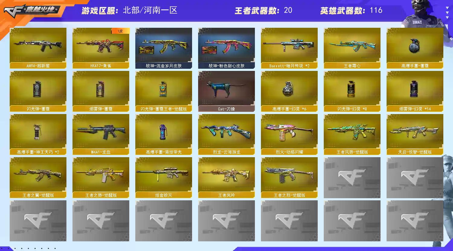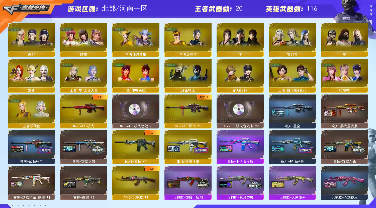 首页 > 租号大厅 > 穿越火线 > 网通区/河南一区 > 全新生化武器三幻神+周瑜黄忠降龙音你闪耀+幻神音效,隼炽茫蝶刃四盘六烈炼狱音效蝴蝶玄武,皮肤音效众多
