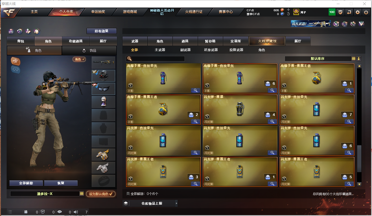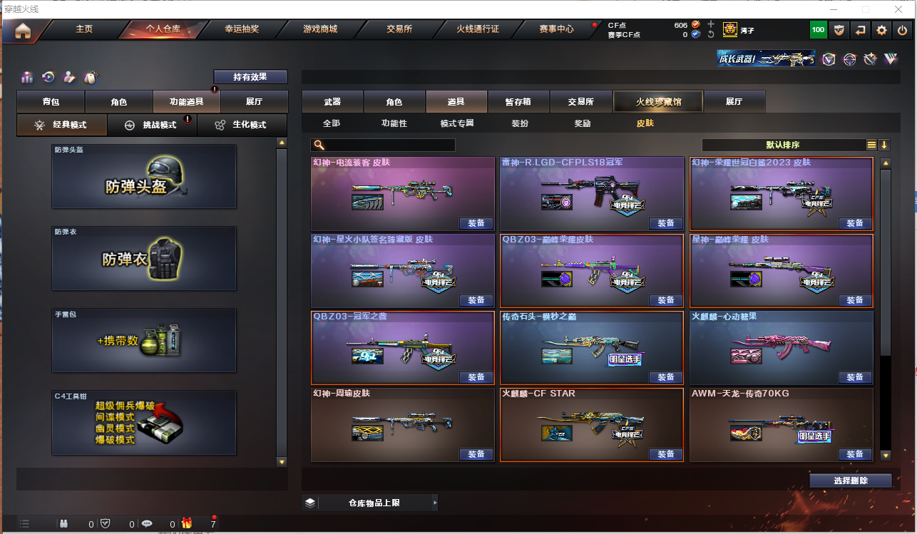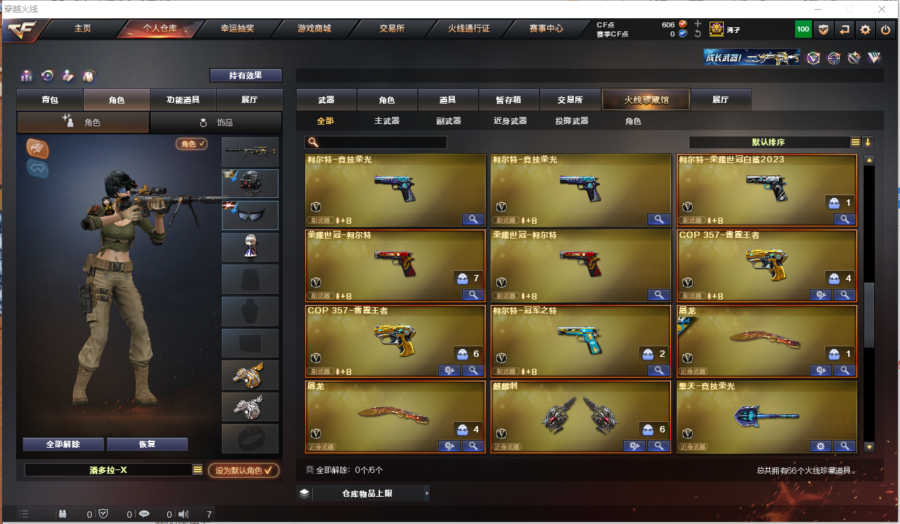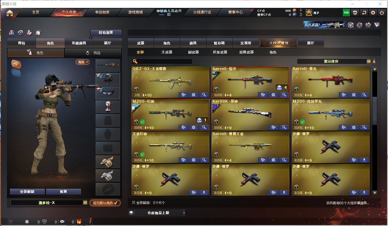 【角色】电竞教官-云悠悠,王者-春,潘多拉-X, 【主武器】M200-幻神, AK47-火麒麟,M4A1-黑龙,M4A1-雷神,M4A1-黑骑士,AK47-黑武士,AK12-天启,AN94-超新星,Scar Linght-白虎,无影-神兵利器,QBZ03-金色蔷薇,M4A1-赤狱骑士,Barrett-毁灭。Barrett-极光,Kar98K-星神,m200-竞技荣光,炫金骑士,QBZ03-王者蔷薇,M4A1-雷霆王者,Barrett-雷霆王者,王者幻神, 【副武器】沙鹰-修罗,沙鹰-天神,USP-雷暴,柯尔特-竞技荣光,柯尔特-荣耀世冠白鲨2023,荣耀世冠-柯尔特。柯尔特-冠军之特,COP 357-雷霆王者, 【近身武器】屠龙,麒麟刺,擎天-竞技荣光,雷霆王者之锋, 【投掷武器】雷暴套,竞技荣光套,雷霆王者套, 【音效卡】M4A1-雷神音效卡, 【皮肤】幻神-电流骇客皮肤,幻神-荣耀世冠白鲨2023皮肤,幻神-星火小队签名臻藏版皮肤,幻神-周瑜皮肤,雷神-R.LGD -CFPLS18冠军,QBZ03-巅峰荣耀皮肤,星神-巅峰荣耀皮肤,QBZ03-冠军之薇,传奇石头-横妙之巅,火麒麟-心动糖果,火麒麟-CFSTAR,AWM-天龙-传奇70kg,火麒麟-华夏之心,雷神-荣耀之魄,屠龙-荣耀之魄,毁灭-荣耀之怒,;幻神-星火小队签名臻藏版 皮肤,幻神-荣耀世冠白鲨2023 皮肤,USP-雷暴,荣耀世冠-柯尔特,柯尔特-荣耀世冠白鲨2023,柯尔特-冠军之特,擎天-竞技荣光,