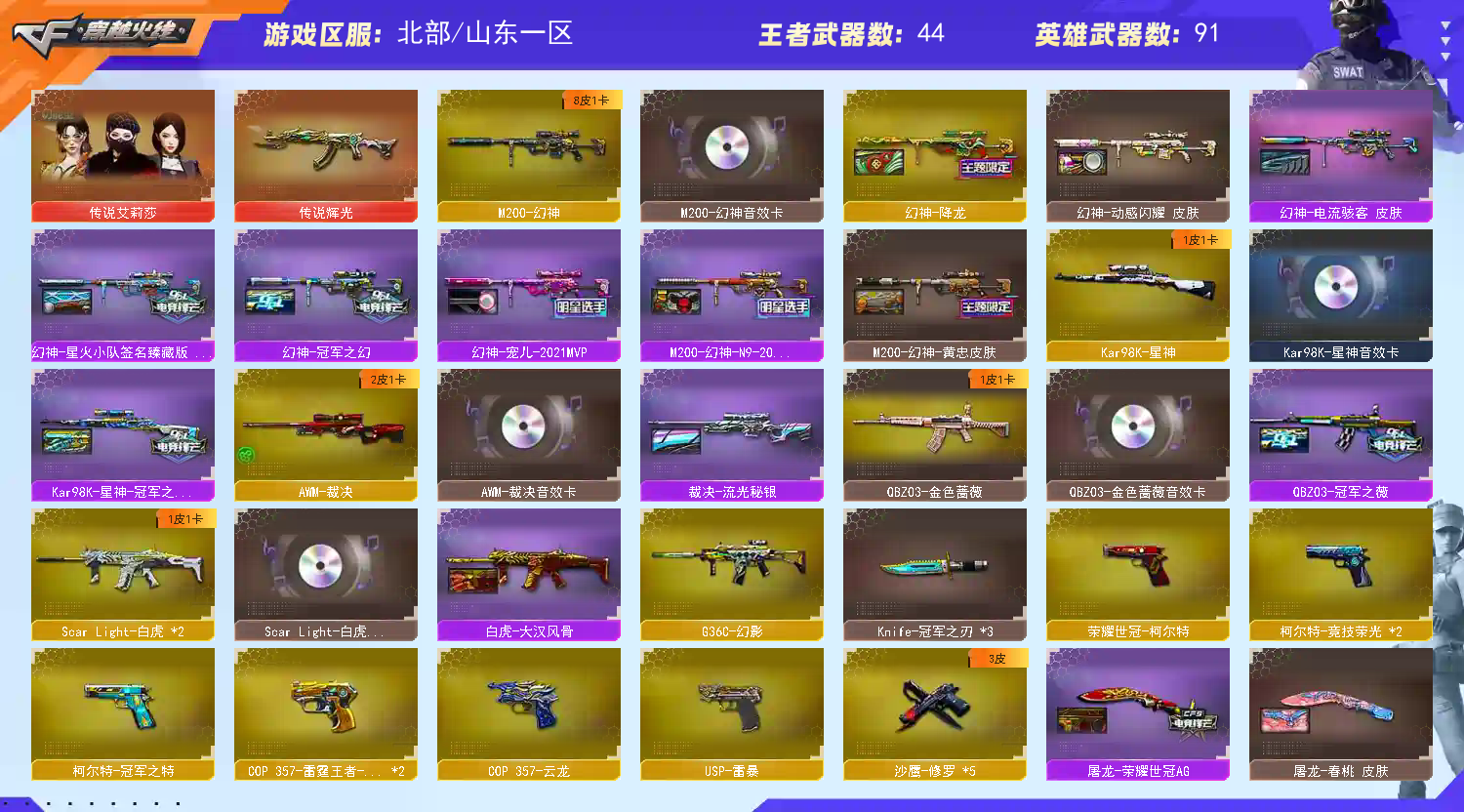 133v 幻神8皮肤✨星火小队.宠儿.N9.冠军之幻.电流骇客.动感闪耀.降龙.黄忠+音效✨星神-冠军之星+音效✨裁决-流光秘银+音效卡✨G36C-幻影✨白虎-大汉风骨.电玩粉兔+音效✨炽芒蝶刃*2✨冠军之特.刃*3.薇+音效✨USP-雷暴+柯尔特*3+COP-云龙.雷霆王者*2✨传说艾莉莎.辉光✨朱雀-武当/玄武/QBZ03-云龙.天罚/白虎-电玩/竞技荣光套/荣耀世冠-雷神/王者星神.风势.火魄.森决.之光.之翼.之鲨.之力.之刺/青龙之魄/毁灭-荣耀.AG冠军.枪娘格雷姐妹.战神张飞.墨兰.青帝.直播专属+音效/雷神-巅峰荣耀.荣耀.冠军.宠儿.荣耀世冠AG.战神赵云.R.LGD冠军.动感闪耀.虎将.耀金.宇航兔.机甲刑天+音效/火麒麟-冠军.盘古.横秒之巅.荣耀世冠AG.传奇.AG.STAR.百城.雷神.心动糖果+音效/黑骑士-冠军.伏羲.马超.AG冠军典藏+音效/黑龙-冠军+音效/修罗-冠军.STAR.星空/屠龙-荣耀.荣耀世冠AG.春桃/龙啸-冠军/擎天-冠军.蒸汽钟表/麒麟刺-月.糖果/关小羽/云悠悠/炫/迷迭香/幽/晴雅/乔伊教练/灵动武士/16音效卡/Vip6;USP-雷暴,荣耀世冠-柯尔特,柯尔特-冠军之特,炽芒蝶刃,Knife-冠军之刃,电竞教官-云悠悠,晴雅,