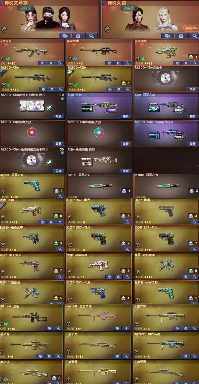 【南部】211v传说女帝⑤传说+幻神四皮❤幻神音效卡金蚀+六列六盘炼狱双全装❤音效卡啦满雷神虎牙平台;幻神-冠军之幻,M200-幻神音效卡,USP-雷暴,柯尔特-冠军之特,炽芒蝶刃,擎天-竞技荣光,传说女帝,