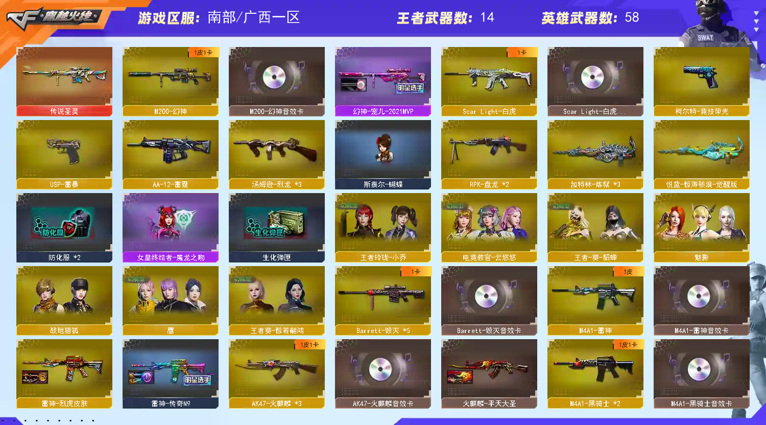 ★收藏好评! 由于异地登录保护机制,部分客户在使用客户端自动上号时会出现密码错误,注意本号密码不会错误,请多尝试5-6次!本账号已经过虚拟财产,请各位科技大神高抬贵手。请素质租号,文明游戏,谢谢大家配合!!;USP-雷暴,电竞教官-云悠悠,RPK-盘龙,M200-幻神,Scar Light-白虎,