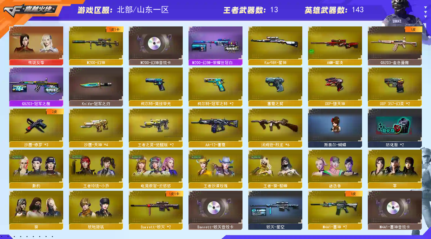 ★收藏好评! 由于异地登录保护机制,部分客户在使用客户端自动上号时会出现密码错误,注意本号密码不会错误,请多尝试5-6次!本账号已经过虚拟财产,请各位科技大神高抬贵手。请素质租号,文明游戏,谢谢大家配合!!;柯尔特-冠军之特,Knife-冠军之刃,传说女帝,电竞教官-云悠悠,王者沙漠玫瑰,QBZ03-金色蔷薇,M200-幻神,