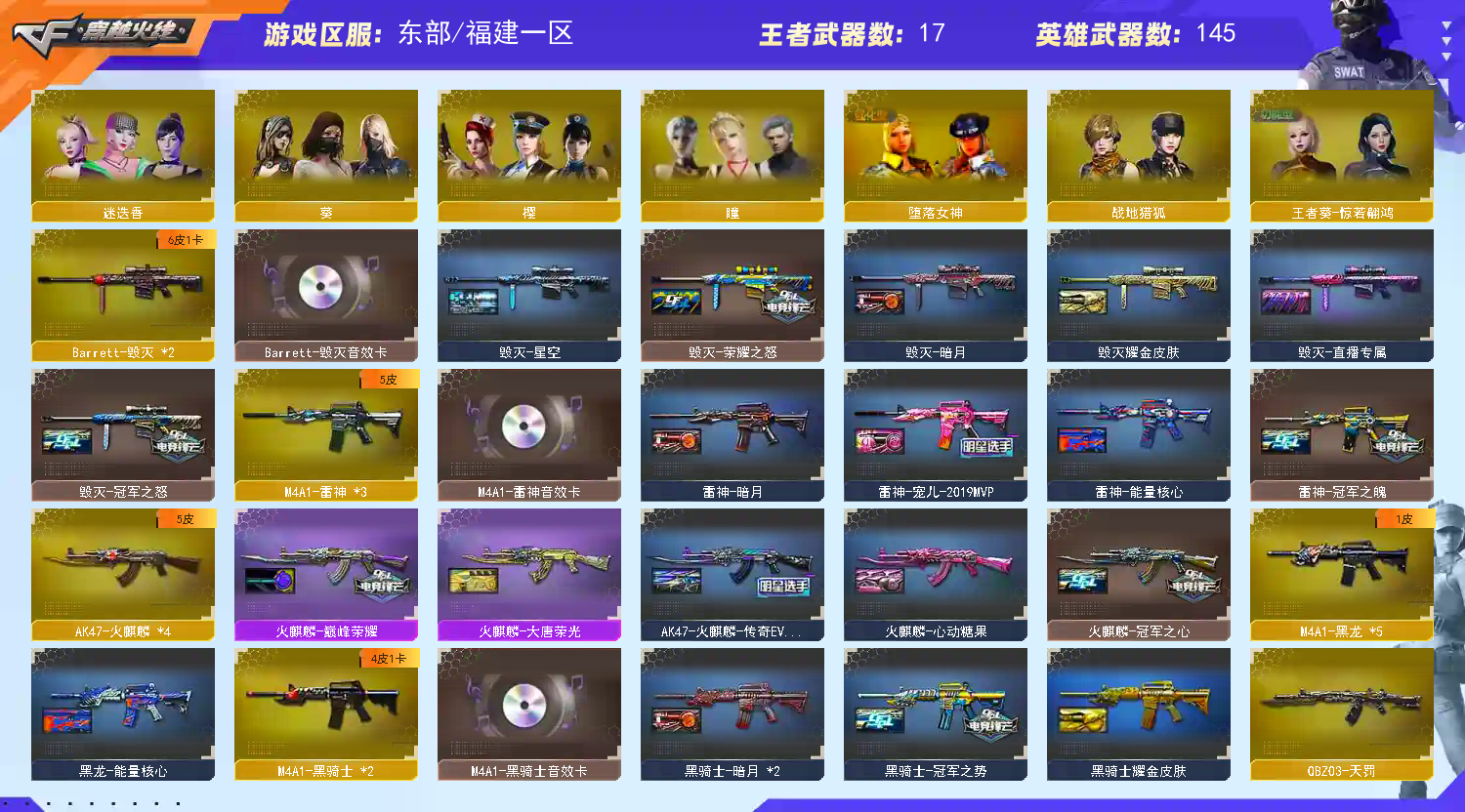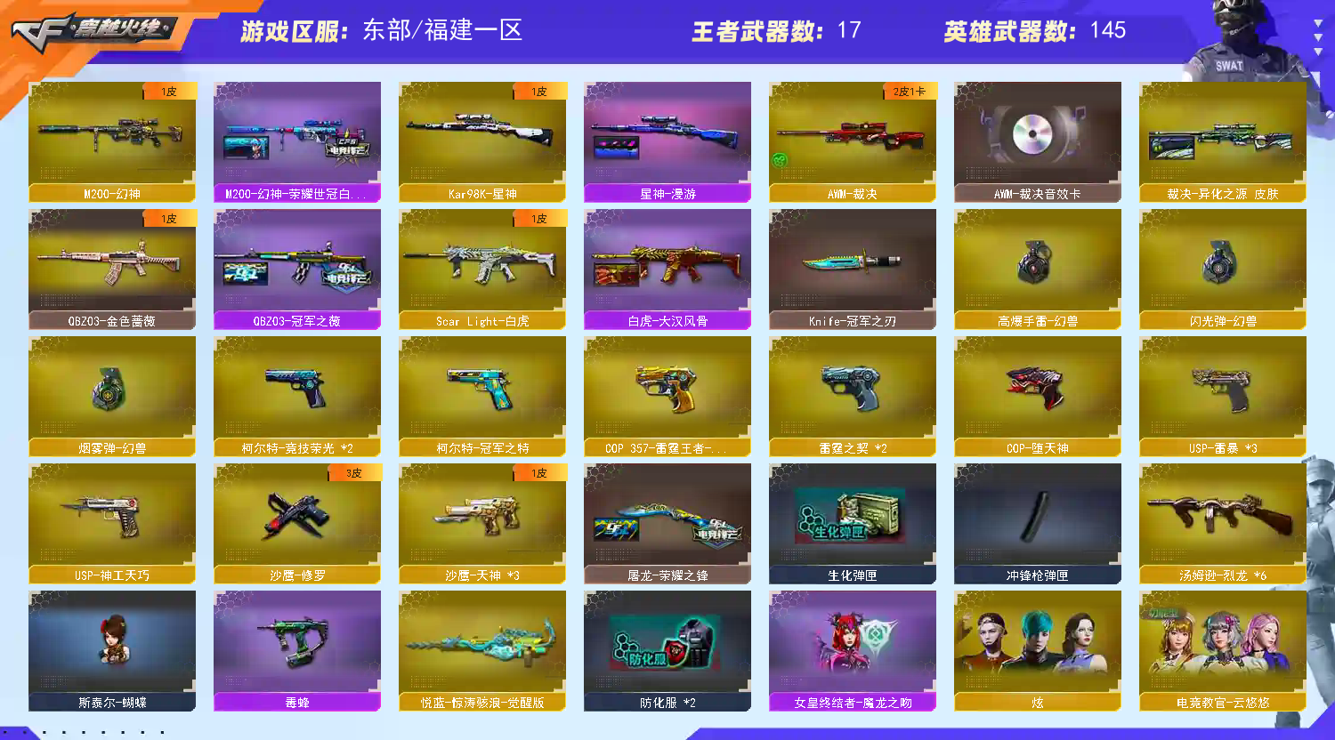 :炫金天龙;炼狱-悦蓝;炫金无影;炫金雷神;王者之翼;王者之武;王者之光;COP 357-雷霆王者-觉醒版;王者之决-觉醒版;王者之击-觉醒版;王者之啸-觉醒版;王者之幻-觉醒版;王者之怒-觉醒版;王者之烈-觉醒版;王者之锋-觉醒版;王者之魂-觉醒版;王者之魄-觉醒版;王者龙血;炫金骑士;炫金千变;炫金超新星 英雄武器:M4A1-死神;AN94-超新星;M4A1-千变;M4A1-黑骑士;M4A1-玫瑰精灵;AK47-黑武士;屠龙;龙啸;麒麟刺;AK47-火麒麟;女皇利刃-幻兽;闪光弹-幻兽;AWM-天龙;烟雾弹-幻兽;Barrett-毁灭;汤姆逊-烈龙;沙鹰-修罗;加特林-炼狱;沙鹰-天神;高爆手雷-幻兽;M4A1-雷神;沙鹰-幻兽;M4A1-黑龙;M200-幻神;M4A1-雷霆;USP-雷暴;高爆手雷-雷暴;烟雾弹-雷霆;雷霆之怒;闪光弹-雷霆;闪光弹-雷暴;烟雾弹-雷暴;斩神刀-雷暴;M200-竞技荣光;擎天-竞技荣光;柯尔特-冠军之特;柯尔特-竞技荣光;烟雾弹-竞技荣光;闪光弹-竞技荣光;高爆手雷-竞技荣光;Scar Light-白虎;M4A1-神工天巧;USP-神工天巧;高爆手雷-神工天巧;闪光弹-神工天巧;高爆手雷-雷霆;唐刀-神工天巧;AK-47-猩红传说;无影-神兵利器;烟雾弹-神工天巧;Barrett-暗月传说;QBZ03-金色蔷薇;QBZ03-天罚;Kar98K-星神;黑武士-锦绣游龙;擎天;COP-堕天神;AWM-裁决;高爆手雷-堕天神;龙啸-堕天神;麒麟刺-堕天神;闪光弹-堕天神;烟雾弹-堕天神;AK47-雷暴;AK47-B-常胜将军;AK47-B-身先士卒;雷霆之契;雷霆之锋;AK47-B-战神;AK47-B-战士 装饰品:天龙-秘银;死神-秘银;黑龙-暗月;雷神-暗月;黑骑士-暗月;无影-暗月;毁灭-暗月;天神-暗月;雷神-能量核心;黑龙-能量核心;修罗-能量核心;王者刀锋玩偶;AWM-天龙-传奇白鲨;火麒麟-冠军之心;AWM-天龙-传奇70KG;毁灭-冠军之怒;雷神-宠儿-2019MVP;AK47-火麒麟-传奇EVEN;火麒麟-巅峰荣耀;火麒麟-心动糖果;黑骑士耀金皮肤;毁灭-星空;关羽玩偶;黑骑士-冠军之势;白虎-大汉风骨;火麒麟-大唐荣光;QBZ03-冠军之薇;战神-流金岁月皮肤;战神-紫绶金章皮肤;AK47-B-常胜将军-刘备;小兔姬玩偶;AK47-B-常胜将军-孙权;屠龙-荣耀之锋;毁灭-荣耀之怒;毁灭耀金皮肤;修罗-星空;M200-幻神-荣耀世冠白鲨;星神-漫游;擎天-冠军之击;无影-霓裳皮肤;裁决-异化之源 皮肤;雷神-冠军之魄;魅影玩偶;CFS 击杀图标;绝迹语音包;零-水下丽影玩偶;修罗-冠军之魂 角色:金戈;陈龙野-X;樱;瞳;葵;堕天使;复仇者;幻影;雷霆-β;雷豹;海豹突击队;铁骑;飞虎队;猎狐者;潘多拉;G.E.M.邓紫棋;曼陀罗;刀锋;黑鹰;夜玫瑰;活力灵狐;灵狐者;潜龙队;嘉年华灵狐;木兰;炫;堕落女神;救世复仇;威锋;救世主;电竞教官-云悠悠;王者葵-惊若翩鸿;影武者-X;风暴女;精英部队;猎狐者-X;猎狐者-英特尔;斯沃特精英;新灵狐者;影武者;娜塔莎;新斯沃特-英特尔;迷迭香;灵狐者-职业经理;职业选手 道具:(王者之魄金色光效);(王者之心金色光效);(炼狱-悦蓝金色光效);超级背包;炫彩背包;银蛇戒;烟雾保护头盔;闪光护目镜;防弹衣;防弹头盔;手雷包;C4工具钳;防化服;夺命之镰;变异宝贝;生化弹匣;步枪弹匣;Barrett-毁灭音效卡;M4A1-雷神音效卡;M4A1-黑骑士音效卡;小兔皮;天使之翼;兔子发带;AWM-裁决音效卡;大圣背包;大圣头盔;USP-雷暴,柯尔特-冠军之特,Knife-冠军之刃,电竞教官-云悠悠,QBZ03-金色蔷薇,M200-幻神,Scar Light-白虎,