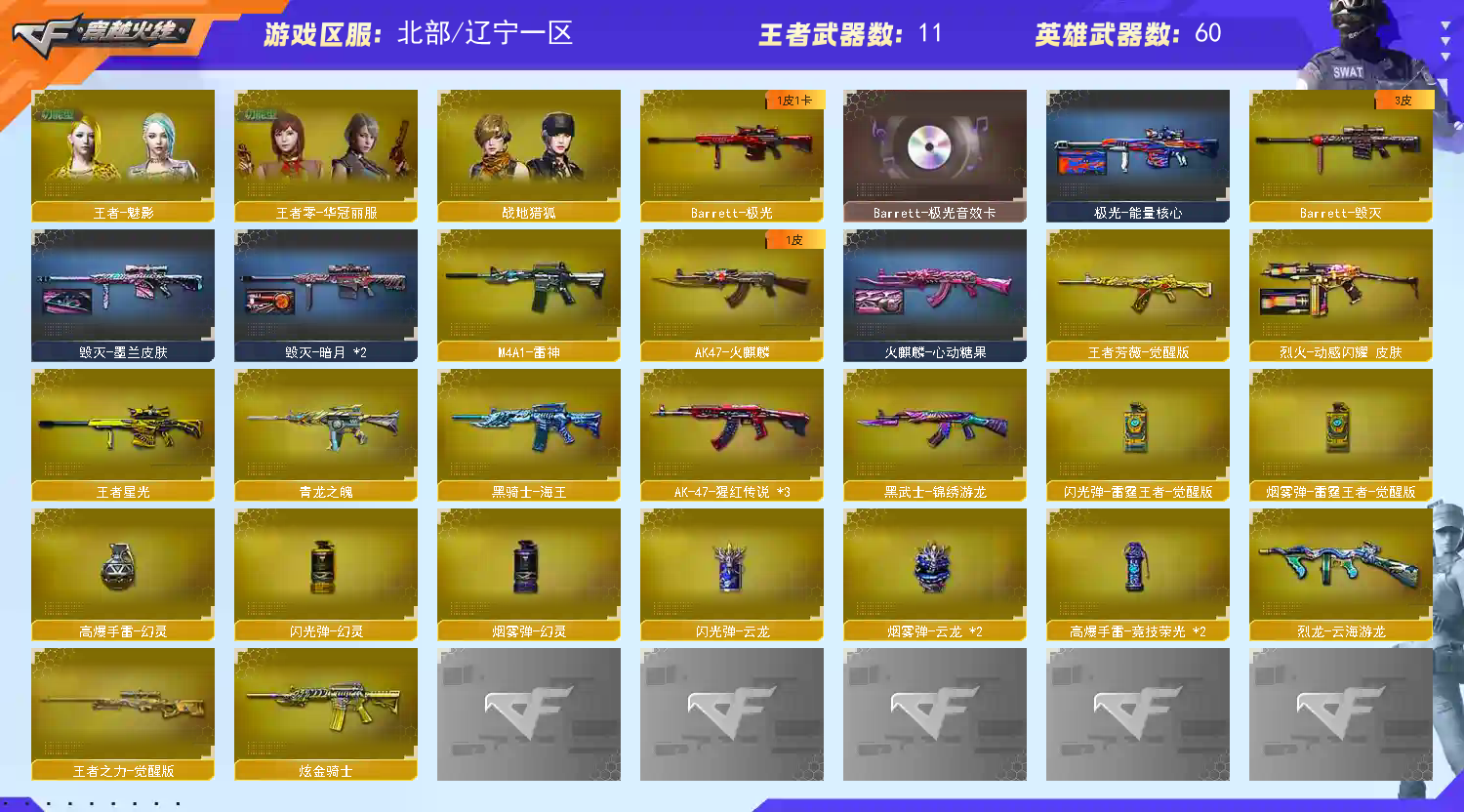 >>>>>>毁号,涉及毁坏虚拟财产罪及计算机安全罪,请文明游戏素质游戏,让我们共建美好租号平台>>>>>> 本游戏账号:英雄武器62个; 王者武器9个。 装备齐全拥有完美游戏体验。重要的是,特殊装备有:M200-幻神、M14EBR-玄武、高爆手雷-竞技荣光、QBZ03-金色蔷薇、AA-12-雷霆、Kar98K-星神、麒麟刺、传说灵眸、M4A1-雷神、AK47-火麒麟、Barrett-毁灭、黑骑士-海王、加特林-炼狱、COP-白鲨、王者星光、高爆手雷-雷霆王者、炼狱-悦蓝-觉醒版、炫金骑士、魂-麒麟刺-萌杀、猫猫手套、枪王之刃、手斧-SS、源-金色蔷薇、源·武圣、灵·Barrett-金色蔷薇-甜蜜火力、灵·QBZ03-金色蔷薇-嘉年华、魂·超新星-春桃、源·Barrett-朱雀、源·火麒麟、源·毁灭、源·超新星、G36C-宇航兔兔、御·黑骑士·哪吒闹海、异变清道夫、AK47-死亡之翼、黄金AK-47、黄金M4A1、M4A1-PINK、M200-枪王排位、M4A1-T、AWM-7周年、MK5-枪王排位、M4A1C-死亡之翼、M4A1-破空冰刃、AWM-Red、黄金M14EBR、M4A1-玫;炽芒蝶刃,传说影煞,隼,RPK-盘龙,QBZ03-金色蔷薇,G36C-幻影,M200-幻神,