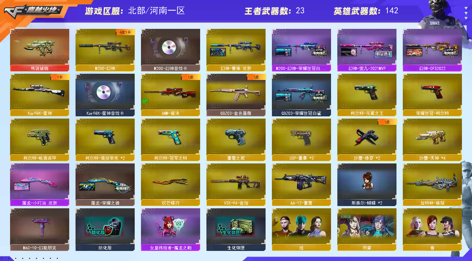 169v 幻神曹操.宠儿.白鲨.2022+音效✨星神+音效✨炽芒蝶刃✨金色蔷薇-白鲨✨柯尔特-无冕之王+传说破晓+冠军之特+USP-雷暴*3+COP-雷霆+柯尔特*5✨金蚀/裁决+异化之源/极光+音效/竞技荣光套/斯泰尔-蝴蝶*2/王者星霆.白虎.风势/毁灭-荣耀.AG冠军.耀金.百城浙江+音效/雷神-荣耀.刘备.宠儿.虎牙.宇航兔+音效/火麒麟-冠军.AG.STAR.雷神.百城.心动糖果.轻羽/黑骑士-冠军.马超.破界.摸金校尉/修罗-2018.STAR.星空/屠龙+荣耀.小叮当/麒麟刺-白鲨/关小雨/雨棠/春/幽/炽天使/奇洋探员/云悠悠/王者空.玲珑-小乔.樱-热浪之夏.炫/炫/灵狐者-职业经理/魅影/零-水下丽影/职业选手/瞳/樱/5音效卡/13套雷暴/9套竞技荣光/4套雷霆/Vip6;USP-雷暴,柯尔特-无冕之王,荣耀世冠-柯尔特,柯尔特-冠军之特,炽芒蝶刃,电竞教官-云悠悠,QBZ03-金色蔷薇,