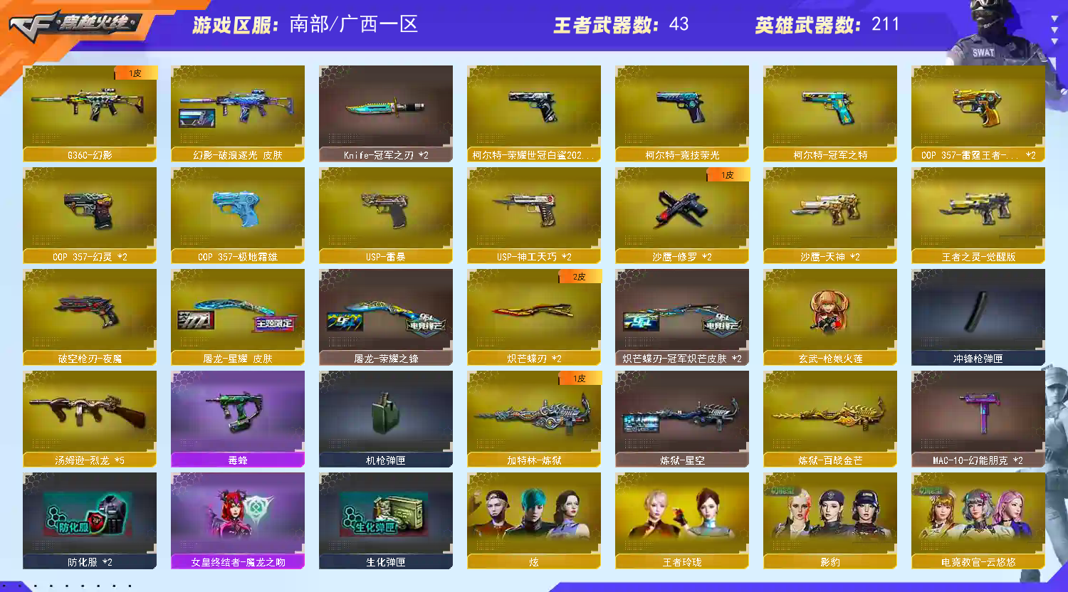 喜欢点个收藏 排位中途禁止退出 违者永久拉黑 排位中途禁止退出 违者永久拉黑 排位中途禁止退出 违者永久拉黑 排位中途禁止退出 违者永久拉黑 🚫温馨提示:此号价值数万,已向公安机关报备,如有开G开辅助封号的,由平台提供身份信息,证据和地址进行报警处理并依法追究责任! 祝各位老板玩得开心。;USP-雷暴,柯尔特-荣耀世冠白鲨2023,传说幽冥,柯尔特-冠军之特,炽芒蝶刃,Knife-冠军之刃,传说女帝,